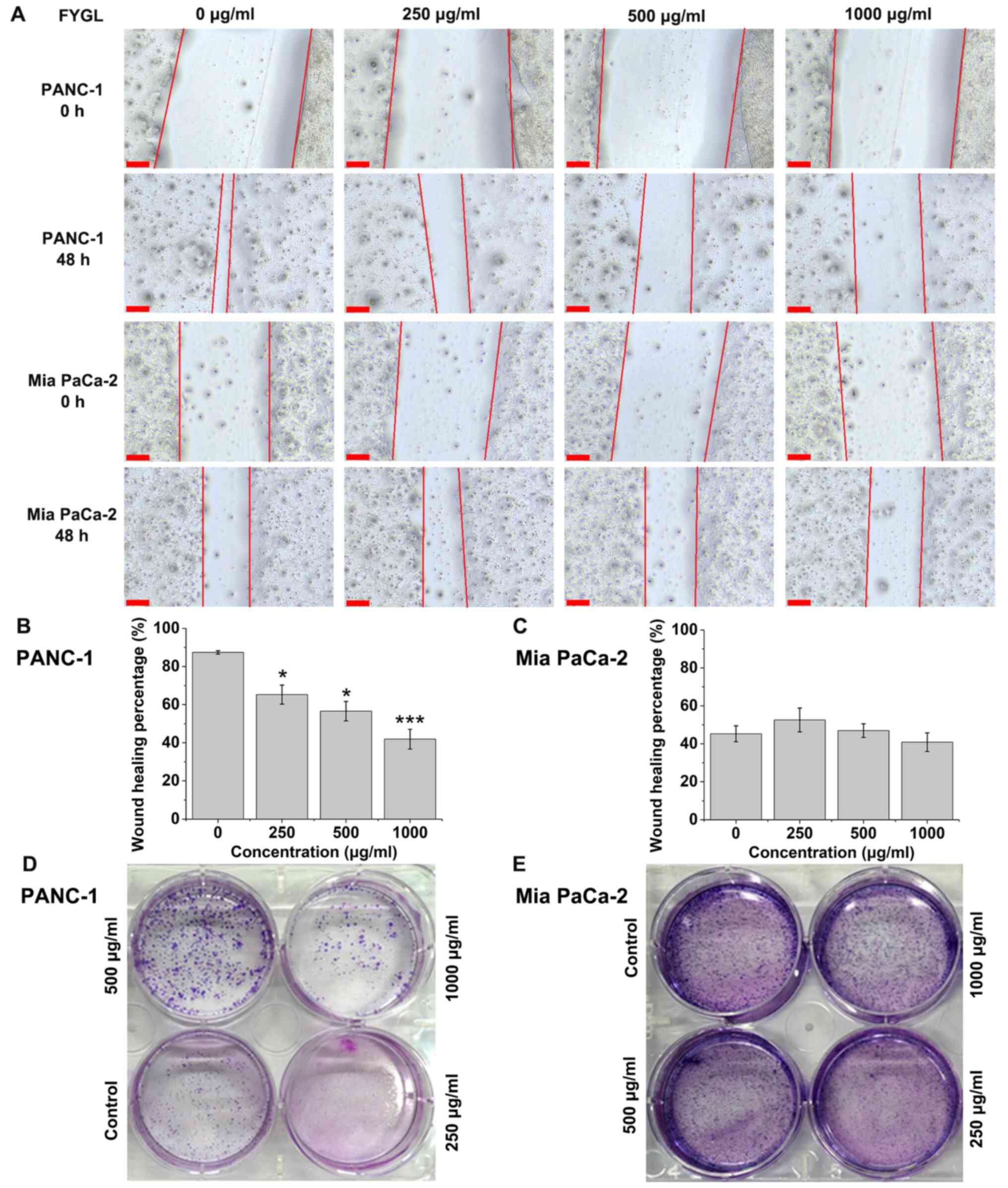 Fig. 3D and E showed the colony formation of the PANC-1 and Mia PaCa-2 cells treated with different concentrations of FYGL. A total of 200 cells, in each well, were incubated with FYGL for 12 days. The colony formation of the PANC-1 cells was low at higher concentrations, indicating sensitivity to FYGL treatment, while there was a high number of colonies with the Mia PaCa-2 cell line indicating insensitivity to FYGL treatment.