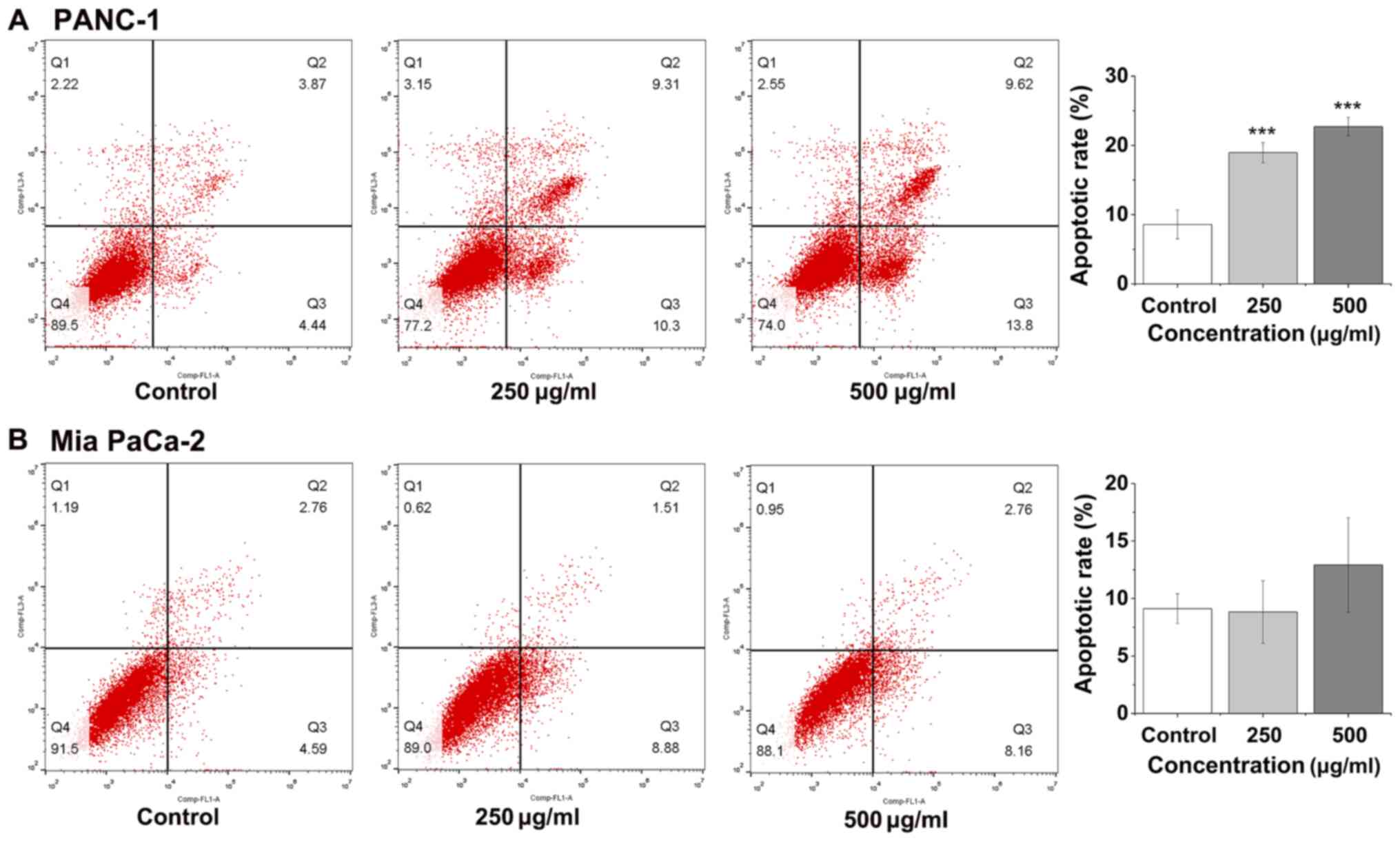 Apoptosis of cancer cells is a critical index for an anticancer drug (23), and is typically investigated using an Annexin V-FITC/PI kit and measured using flow cytometry (24). The apoptotic rate of the PANC-1 cells increased to 23%, as the concentration of FYGL increased to 500 µg/ml (Fig. 4A), however, the apoptotic rate of Mia PaCa-2 cells was unaffected (Fig. 4B).