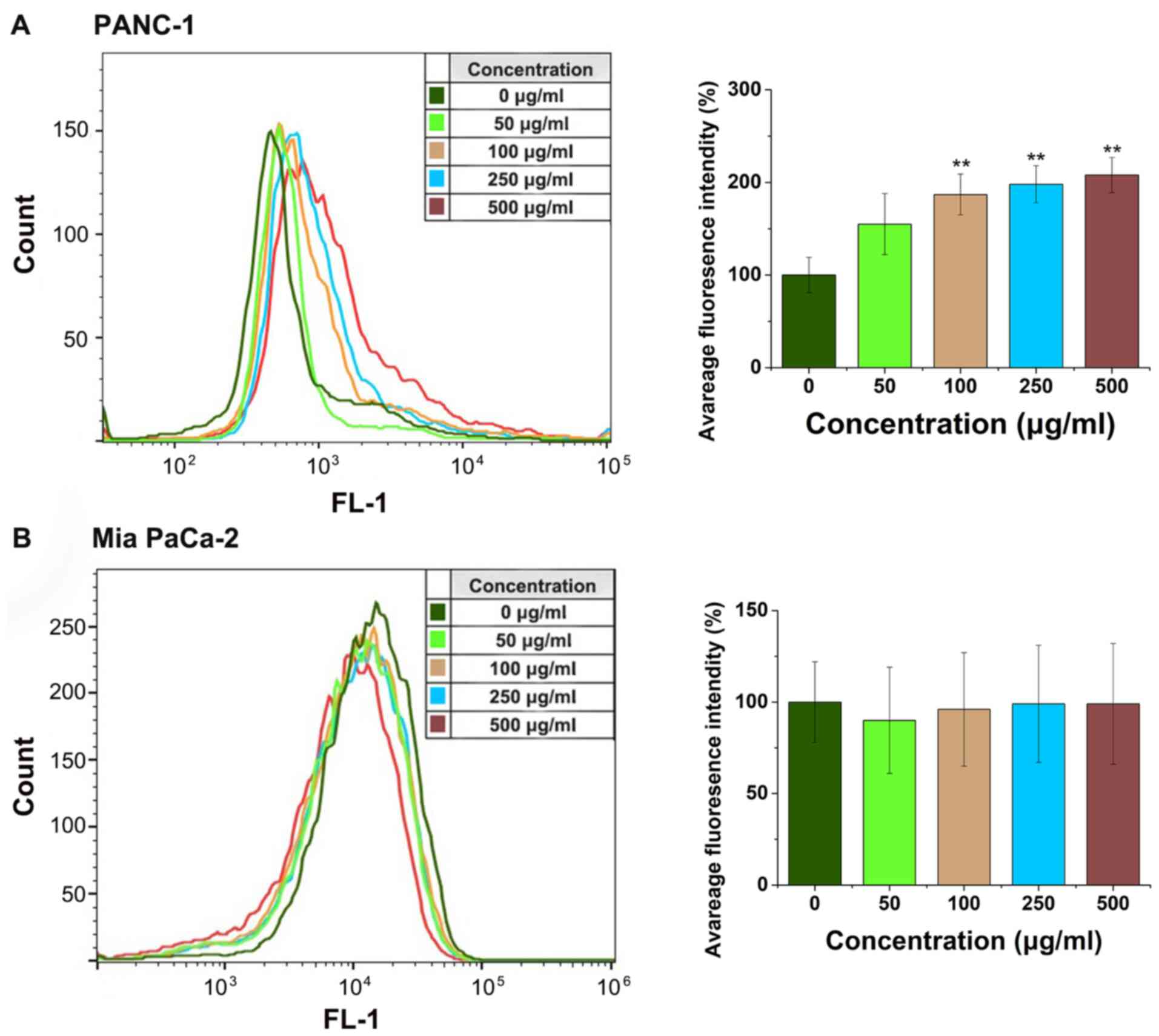The fluorescent probe, DCFH-DA was used to detect ROS in the cells using flow cytometry. Fig. 6A showed that the ROS level in the PANC-1 cells significantly increased as the concentration of FYGL increased from 0 to 500 µg/ml; however, there was no increase in the Mia PaCa-2 cells (Fig. 6B). The decrease of MMP has been associated with the increase of ROS, and with cell apoptosis (11,27).