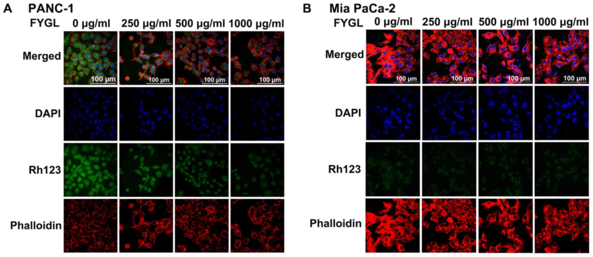 Therefore, in the subsequent experiments, the green fluorescent agent, Rh-123 was used to detect the MMP in the PANC-1 and Mia PaCa-2 cell lines, treated with FYGL for 24 h and analyzed using confocal microscopy. Fig. 7A and B showed the fluorescent images of the PANC-1 and Mia PaCa-2 cell lines, respectively; wherein blue, green, and red represent the cell nucleus (DAPI), MMP (Rh-23), and cytoskeleton (rhodamine-labeled phalloidin), respectively. The MMP was found to be deceased in the PANC-1 cells, as the concentrations of FYGL increased; however, there was no marked change in the Mia PaCa-2 cells, which were consistent with the results from the ROS experiments. The results indicated that FYGL could selectively induce the production of ROS, leading to the reduction of the MMP and apoptosis in the PANC-1 cells line.