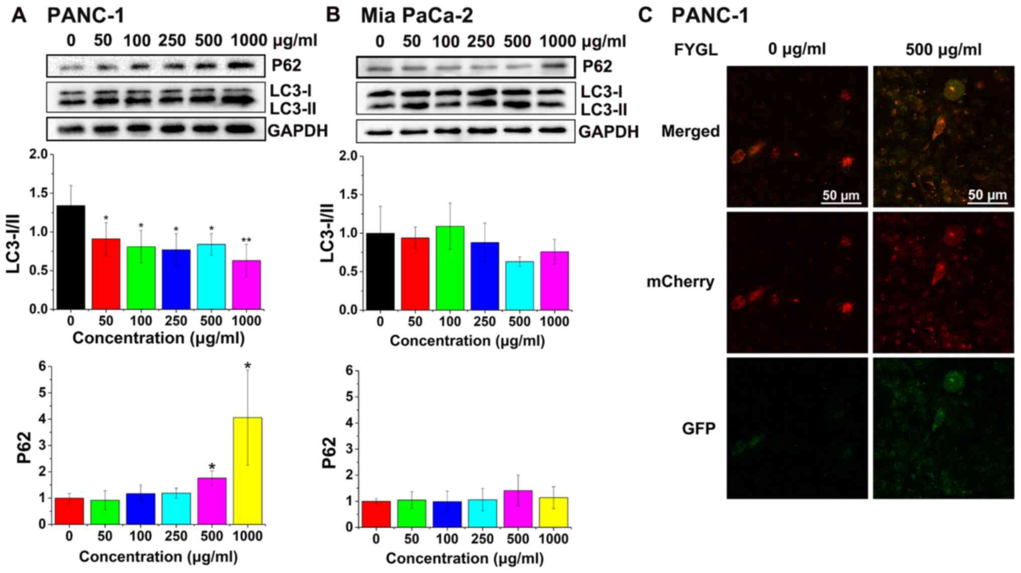 Fig. 9A and B showed the protein expression level of LC3-I/II and P62 in the PANC-1 and Mia PaCa-2 cells, respectively, treated with different concentrations of FYGL for 24 h. In the PANC-1 cells, the cascade protein ratio of LC3-I/II significantly decreased at 50, 100, 250, 500 and 1,000 µg/ml concentrations of FYGL compared with that in the control group further indicating that there was an increase in the number of autophagosomes in the PANC-1 cells. However, it was found that in the PANC-1 cells treated with different concentrations of FYGL, the relative protein expression level of P62 was significantly increased, at 500 and 1,000 µg/ml compared with that in the control group, indicating that the cell autophagy process was halted, and not completed in the signaling pathway. In the Mia PaCa-2 cell line, the ratio of LC3-I/II decreased at 50, 250, 500 and 1,000 µg/ml concentrations of FYGL and increased at 100 µg/ml concentrations of FYGL, but no significant differences were observed compared with that in the control group. The protein expression levels of P62 in the Mia PaCa-2 cells increased at 500 and 1,000 µg/ml concentrations of FYGL, but no significant differences were observed compared with that in the control group. These results indicated that FYGL had almost no effect on the autophagy of Mia PaCa-2 cells.