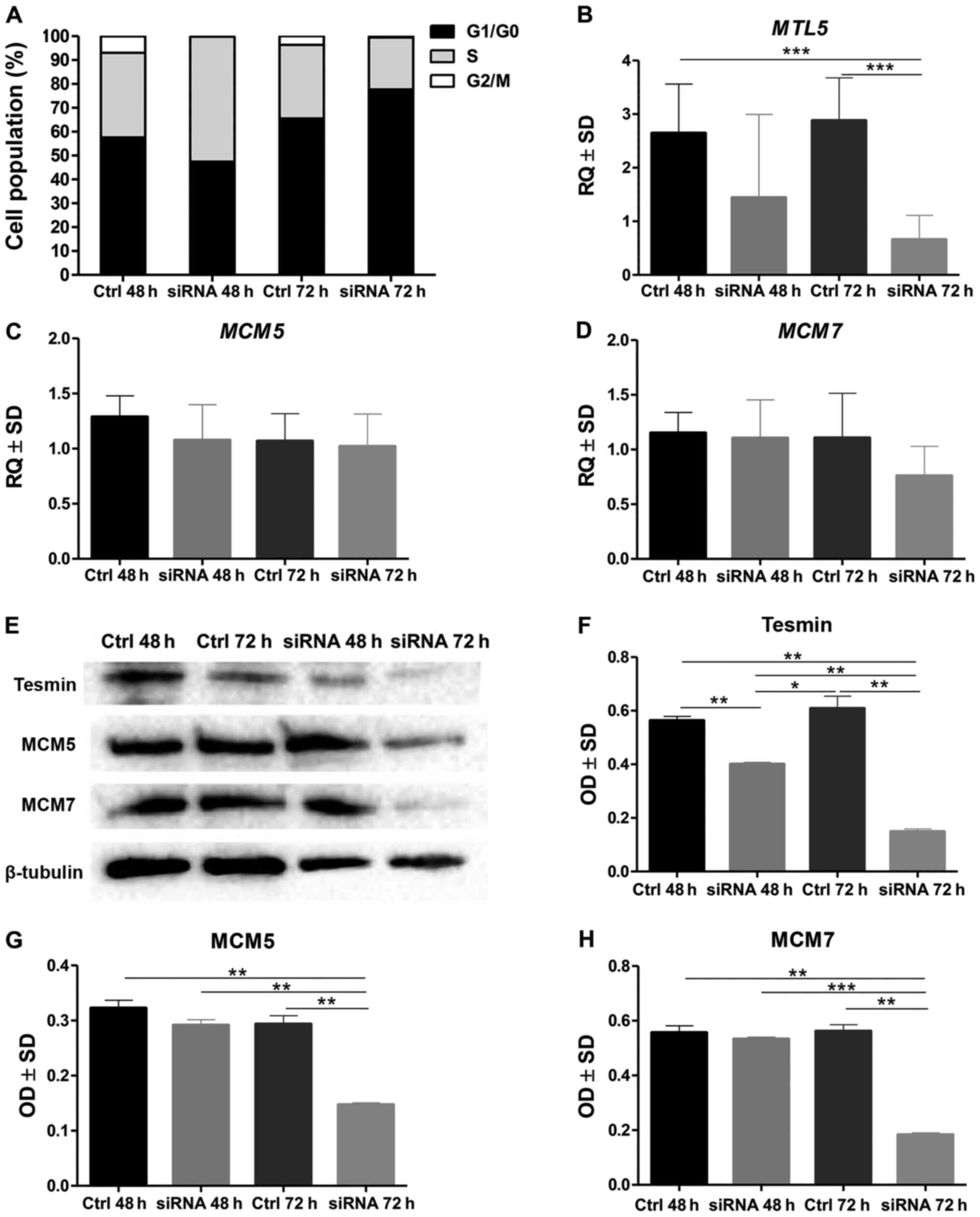 Moreover, the statistical analysis of the results obtained by RT-qPCR showed a significantly lower expression of MTL5 mRNA in the line with the silenced expression of this gene compared to the control line, as well as no differences in the expression of MCM5 and MCM7 in the line with silenced MTL5 expression compared to the control line (Fig. 1B-D). In contrast, the expression of the tesmin, MCM5 and MCM7 proteins (analysed by means of optical density obtained by WB method) was lower in the line with silenced MTL5 expression than in the control line (Fig. 1E-H).