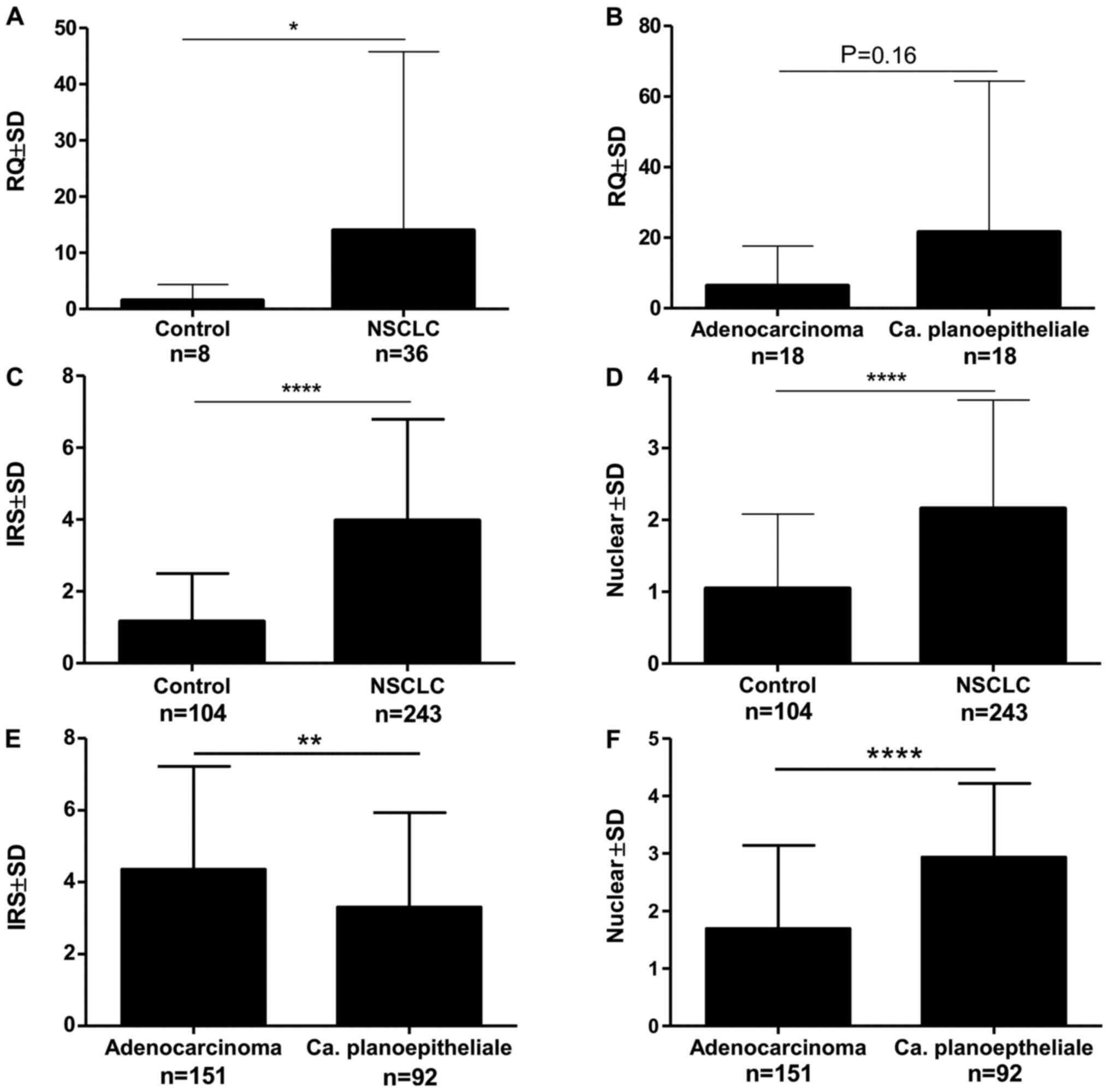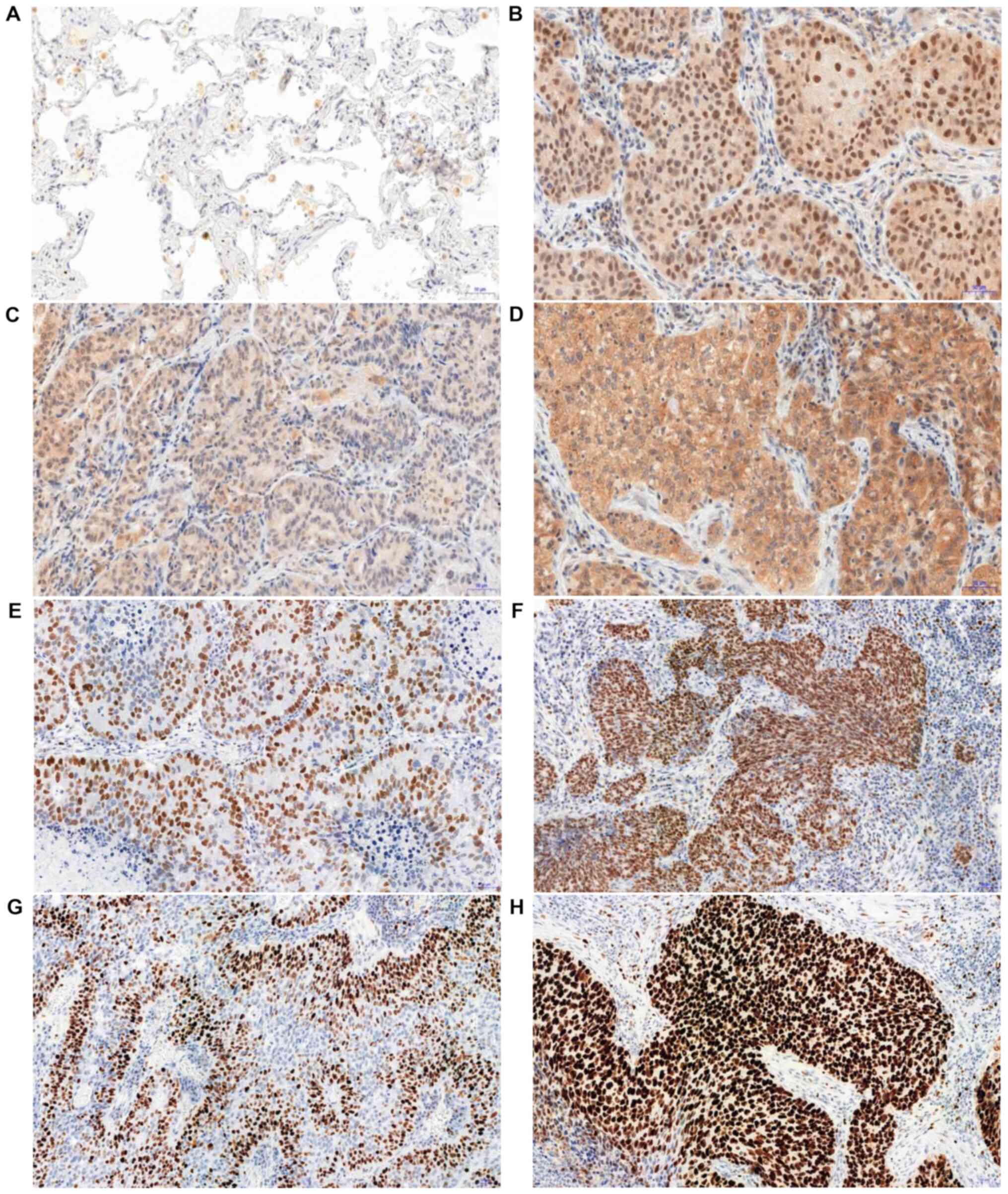 Lung cancer is currently one of the most common cancers and one of the most frequent causes of death worldwide (1). Non-small cell lung cancers (NSCLCs) constitute ~80% of all lung cancer cases. Adenocarcinoma, squamous cell carcinoma and large cell carcinoma are the three main histological subtypes of NSCLC, which account for 40, 25 and 10% of all the diagnosed cases of NSCLC, respectively (2). The course and prognosis of non-small cell lung cancers are associated with several factors, such as the histological type of cancer, the pTNM staging system and the presence of the EGFR gene mutation or the EML4-ALK fusion gene (3).