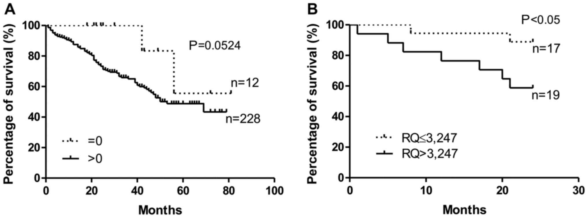 The tumour fragments and the tissue fragments from the surgical margin were frozen in liquid nitrogen, then the tumor cells and the normal lung tissue cells were isolated by laser microdissection and used to analyse MTL5, MCM5 and MCM7 mRNA expressions. The median time that these cases were followed for was 24 months (range: 0–24 months, mean of 20.44±7.137). During the follow-up period, 18 patients died.