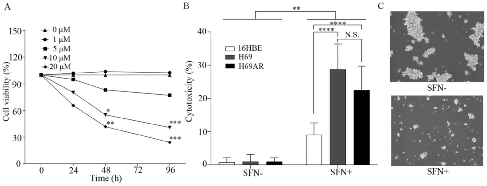 The cell death effects of SFN in the SCLC H69 and H69AR, and the normal bronchial epithelial cell line, 16HBE cell lines were initially observed to occur in a dose-dependent manner (data not shown). The cell death effects (cytotoxicity) of SFN (20 µM) in the H69, H69AR and 16HBE cell lines, after 96 h were measured using LDH assays (Fig. 1B). A significant cell death effect was shown in the SCLC and 16HBE cell lines following 20 µM SFN treatment compared with that in the untreated cells. However, the cell death effect in the 16HBE cell line was significantly less compared with that in the SCLC cell lines. Furthermore, the cell death effect was not significantly different between the H69 and H69AR cell lines. Similar results were observed using the SCLC H82 cell line. Significant inhibition of cell growth was observed at 24 h following >20 µM SFN treatment, at 48 h with >10 µM SFN treatment, and at 96 h with >5 µM SFN treatment. Cell death effects of SFN in H82 small cell lung cancer cells were observed to occur in a dose-dependent manner (Fig. S1). Fig. 1C shows representative images of H69 cell death in SFN-treated (20 µM) and untreated controls from the LDH assay experiments.