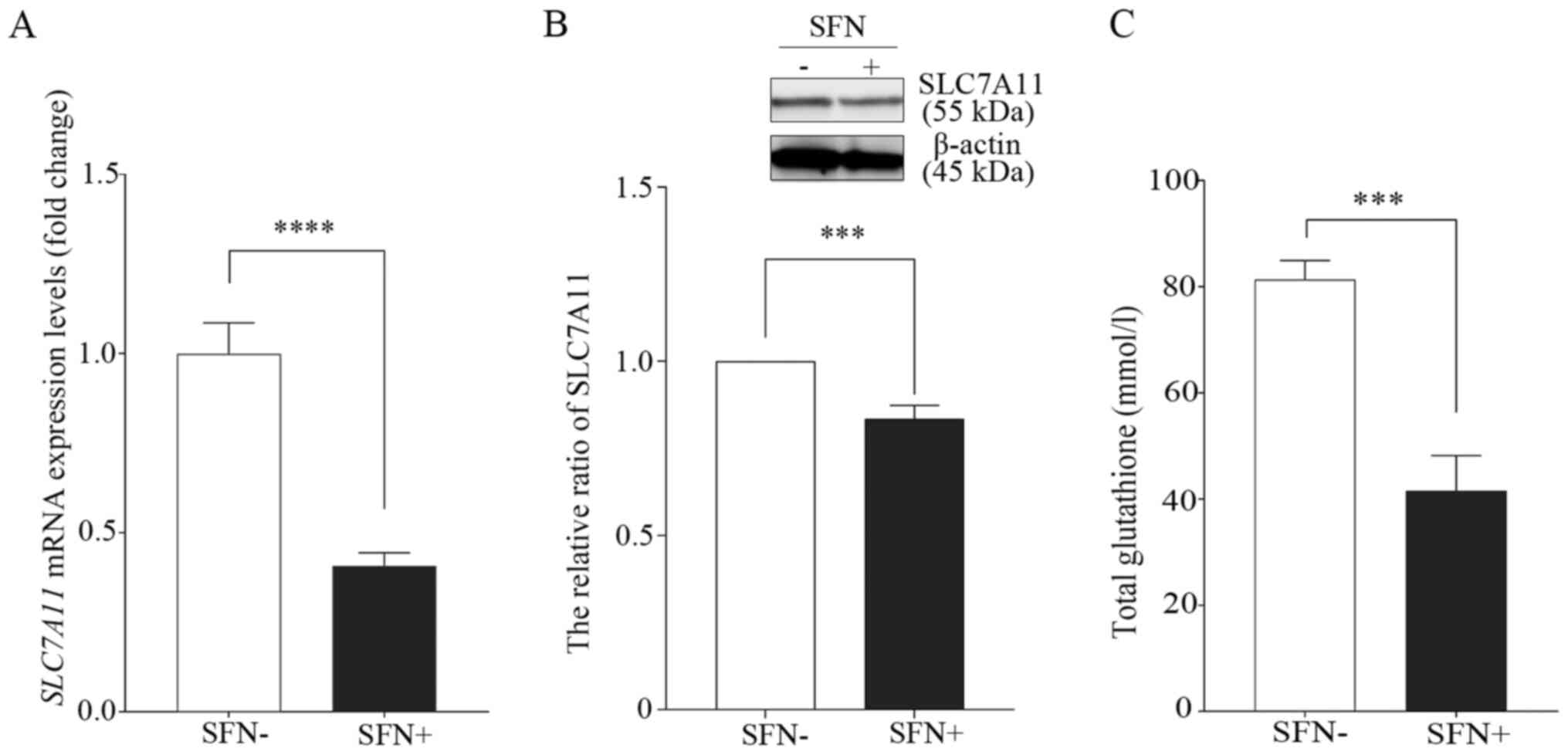 Previous studies have showed that ferroptosis was initiated by the inhibition of system xc-, which leads to a depletion of GSH levels (17,20). RT-qPCR was performed to determine the mRNA expression levels of SLC7A11, a member of system xc-, following treatment of the H69 cell line with SFN (Fig. 3A). The mRNA expression levels of SLC7A11 were 1.00±0.21 in the untreated control cells; however, they were 0.41±0.09 in SFN-treated cells (20 µM, 96 h). Thus, the mRNA expression levels of SLC7A11 were significantly lower in the SFN-treated cells compared with that in the untreated cells. In addition, the protein expression levels of SLC7A11 in the SFN-treated cells were significantly lower compared with that in the untreated control group (Fig. 3B).