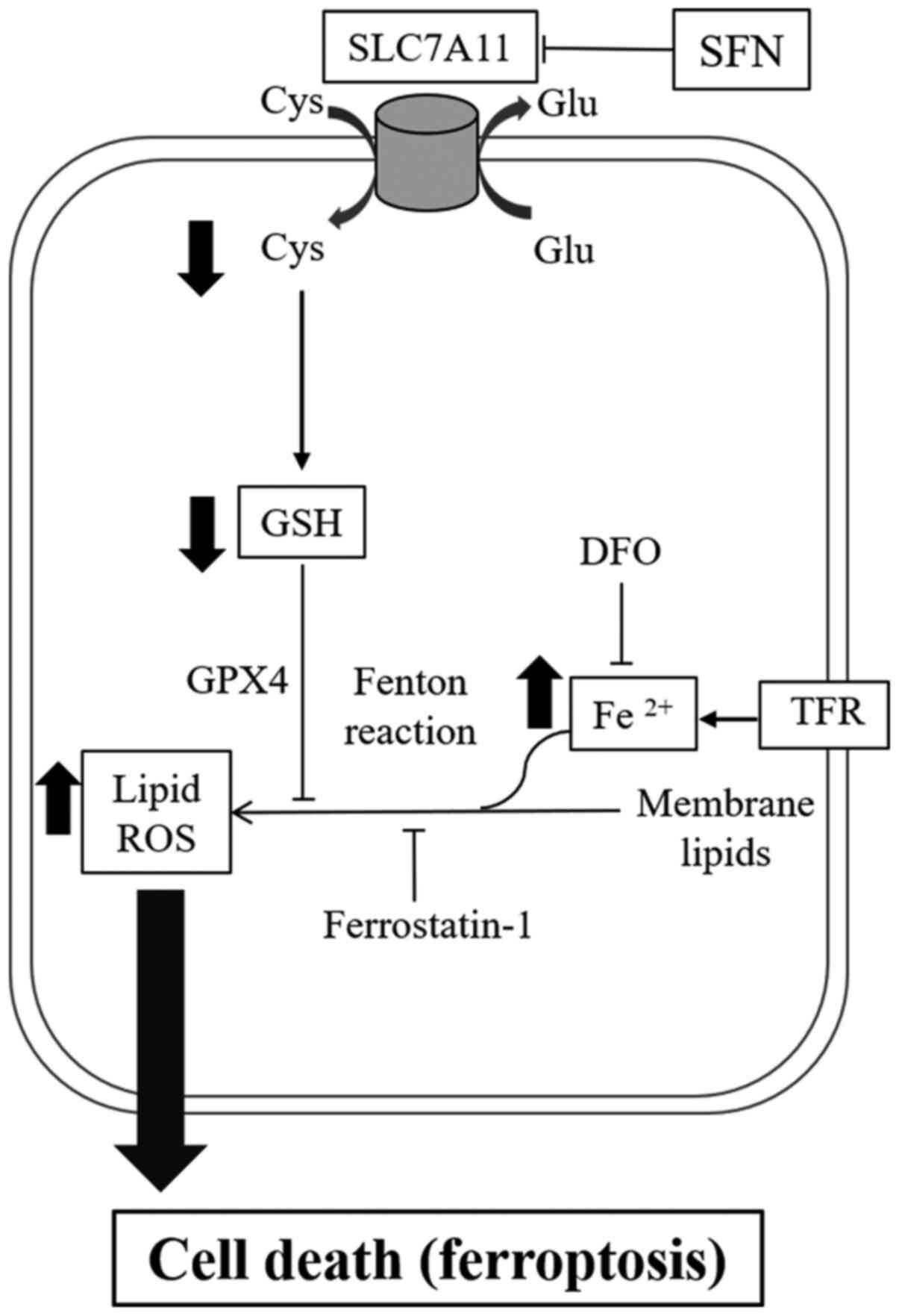A number of mechanisms have been reported for ferroptosis inducers. For example, erastin and sorafenib induced ferroptosis by inhibition of system xc- (17). RSL3 has also been reported to directly inhibit GPX4 activity (22). The present study investigated the mechanisms of SFN-induced ferroptosis in 2 SCLC cell lines. According to the RT-qPCR and western blot analysis results, the mRNA and protein expression levels of SLC7A11, a component of system xc-, were significantly decreased following treatment with SFN. The present results demonstrated that inhibition of SLC7A11 expression levels, which was triggered by SFN-induced ferroptosis, resulted in decreased intracellular cystine and GSH and iron-dependent lipid peroxidation (Fig. 4).