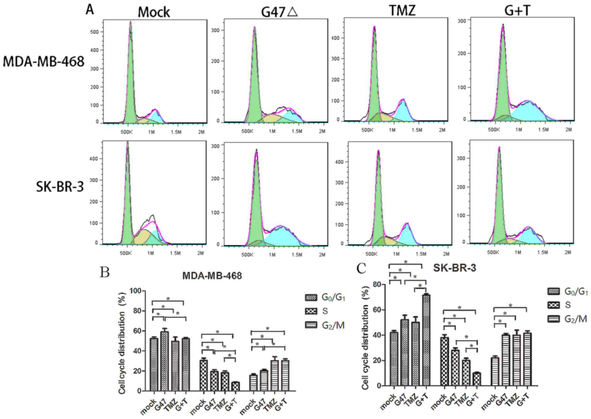 The present study also demonstrated that G47Δ and TMZ in combination synergistically induced breast cancer cell apoptosis. A previous study demonstrated that HSV can induce robust apoptosis of TMZ-resistant glioma cells both in vitro and in vivo, indicating synergy between G47Δ and TMZ (27). DNA damage promotes cell apoptosis if such DNA damage is not repaired (22,28,29). In TMZ-resistant breast cancer, repairing TMZ-induced DNA damage promotes G47Δ replication in breast cancer cells. These cells are lysed, triggering the host immune response and resulting in cytokine-induced cancer cell apoptosis (30). In addition, the synergistic role of G47Δ and TMZ in DNA damage may interfere with DNA replication in breast cancer cells, further affecting cancer cell division. The present study demonstrated that G47Δ and TMZ exhibited a synergistic effect on induction of breast cancer cell cycle arrest. The cell cycle was arrested at different phases in SK-BR-3 and MDA-MB-468 cells, which is likely due to the different genetic background between these two cell lines (31).