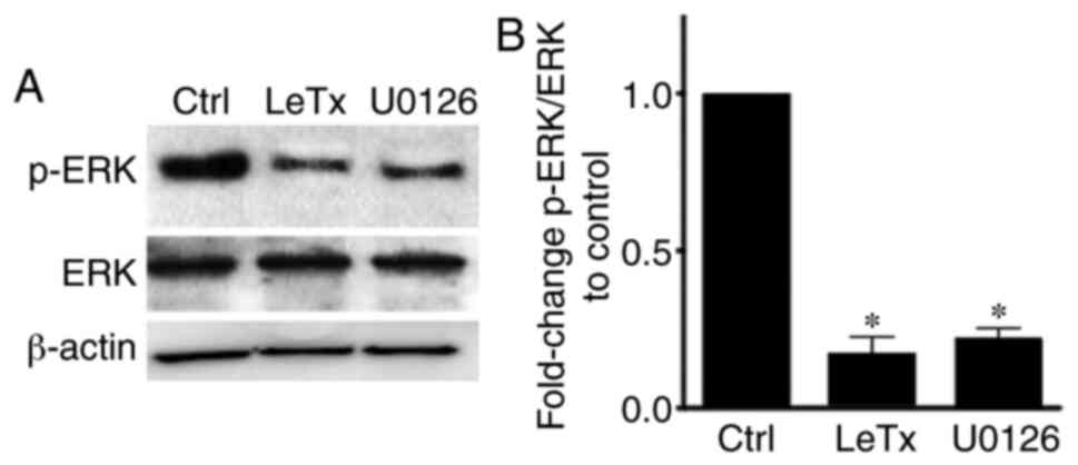 In the ERK MAPK module, MEK1/2 (a MAPK kinase) phosphorylates and subsequently activates ERK (a MAP kinase) (20,21). LeTx is known to cleave MEK by degrading it in order to inhibit the MAPK pathway in cells (26). The present results showed a decrease in the level of p-ERK upon treatment of MBA-MD-231 cells with LeTx and the MEK1/2 inhibitor U0126 in comparison with control, while leaving the total ERK expression intact (Fig. 1).
