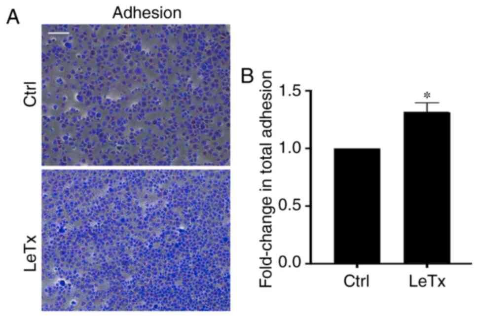 Since treated cells exhibited a reduction in total net path and rate of migration, it was hypothesized that this reduction in migration may be due to an increase in MDA-MB-231 adhesion to the underlying matrix, as previously seen in another tumor model (28). Indeed, cells treated with LeTx displayed a ~0.7-fold increase in adhesion (Fig. 3).
