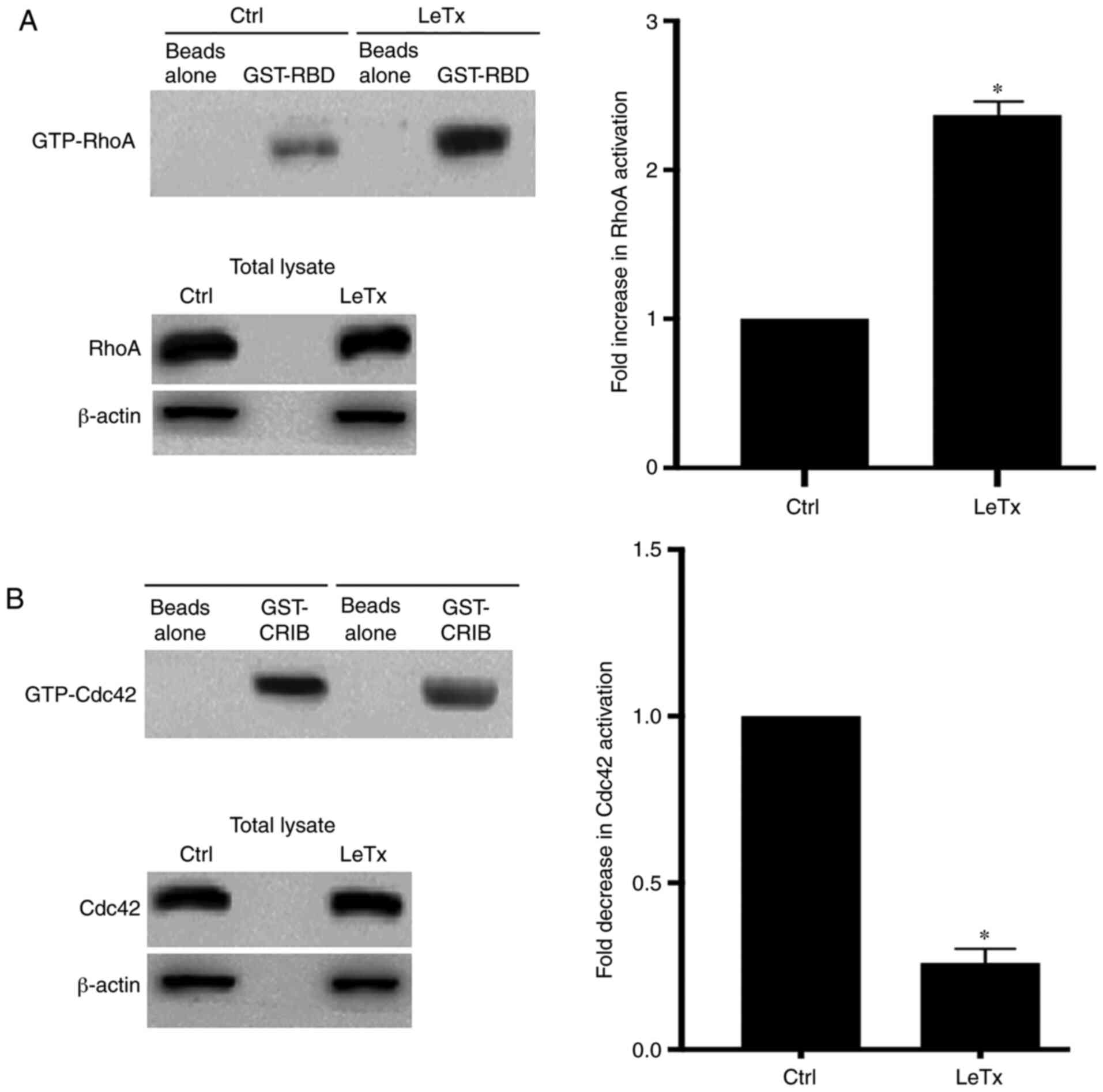 Cell lysates were collected from breast cancer cells following treatment with LeTx (10−8 M PA/10−9 M LF) or U0126 (50 µM) for 24 h. The RhoA/Rac1/Cdc42 Activation Assay Combo kit (cat. no. STA-405; Cell Biolabs, Inc.) was used for a pull-down assay following the manufacturer's instructions. Briefly, the cells were lysed with lysis buffer (25 mM HEPES, 1% Igepal, 150 mM NaCl, 10 mM MgCl2, 10% glycerol, 1 mM EDTA, 1 mM NaVO4, 20 mM NaF, 1 mM PMSF, 100 lg/ml aprotinin and 5 lM leupeptin). Lysates were cleared by centrifugation for 1 min at 1,500 × g at 4°C and incubated with GST-RBD beads (20 µg) or GST-CRIB beads (20 µg) provided in the aforementioned kit for 1 h at 4°C with gentle shaking. Then, samples were centrifuged for 2 min at 1,000 × g at 4°C, and the pellet was washed 3 times with PBS. Beads alone samples (without cell lysate) were used as a negative control and the total cell lysate (before incubation with the beads) were blotted for total RhoA, Cdc42 and β-actin.