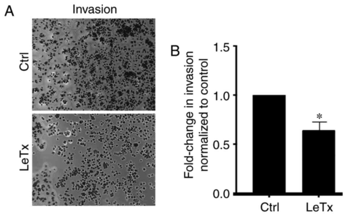 Lastly, the present study explored the effect of LeTx on invasion of MDA-MB-231 cells. Treating the cells with LeTx led to a decrease in invasion. Cdc42 is known to play a role in invasion of cells by contributing to the formation of invadopodia by activating actin-related protein 2/3 via Neural Wiskott-Aldrich syndrome protein and by exerting an effect on matrix metalloproteinases, which is necessary for their translocation to invadopodia (43,44). Having observed decreased Cdc42 activation in treated cells in pull-down assays, it was hypothesized that the effect exerted by LeTx on invasion was through Cdc42.