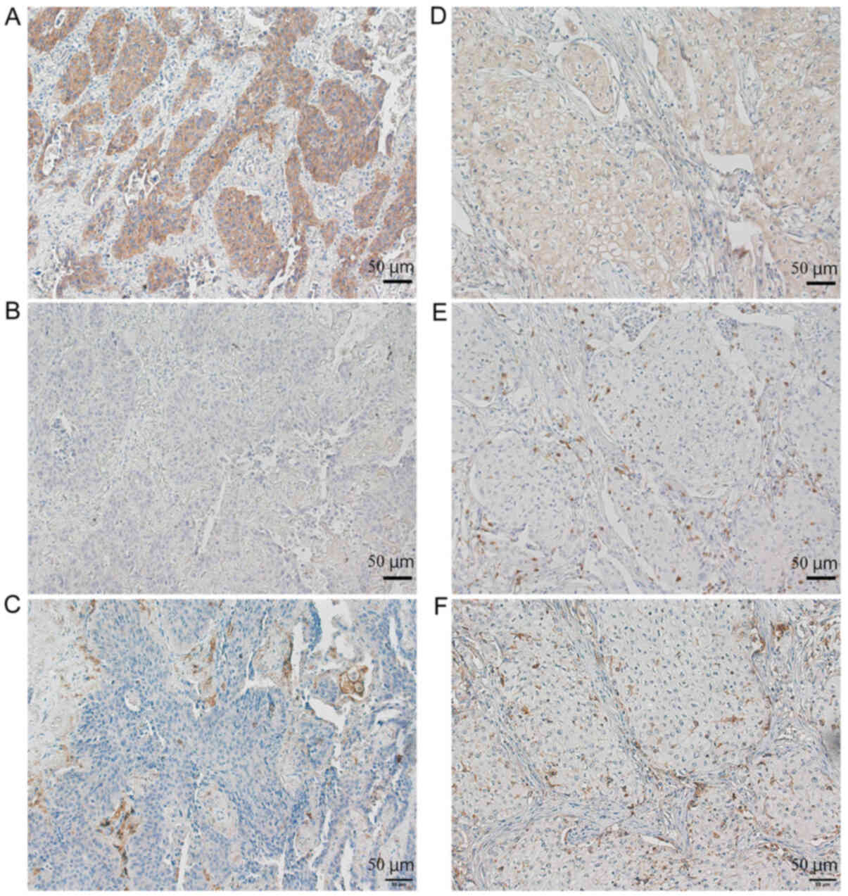 However, whether β-catenin is involved in tumor immune escape mechanisms in lung cancer is unclear. Although NSCLC cases with abnormal β-catenin expression had low numbers of TILs (19), it was unclear whether this was associated with dendritic cells. Therefore, the present study investigated the association between β-catenin expression, TILs, and CD11c+ cells in NSCLC. CD11c is a marker of mononuclear phagocytes (20) and is expressed on antigen presenting cells (APCs) (21). CD11c, also known as integrin α X, is a transmembrane protein. CD11c mediates phagocytosis (22) and binds to cell adhesion molecules (23–25), components of the bacterial wall (26), complement proteins (22,27) and matrix proteins (28,29). TMB and PD-L1 TPS were examined for evaluable cases and their association with β-catenin expression was clarified. Furthermore, the association between overall survival and relapse-free survival was examined.