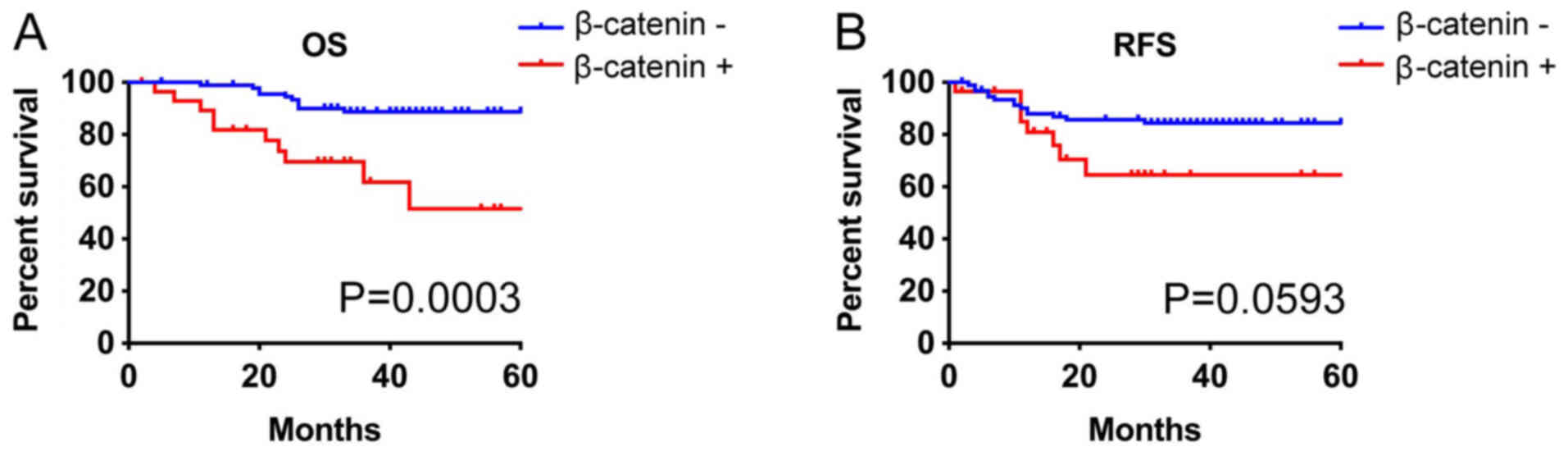 Patient characteristics are presented in Table I. Tumor β-catenin expression was positive in 29 patients (24%). The β-catenin-positive group had higher smoking status and larger tumor size compared with the β-catenin-negative group. β-catenin was more commonly found in squamous cell carcinoma (16%) compared with adenocarcinoma (8%). There was no difference in age, sex, or pathological stage between β-catenin-positive and -negative groups.