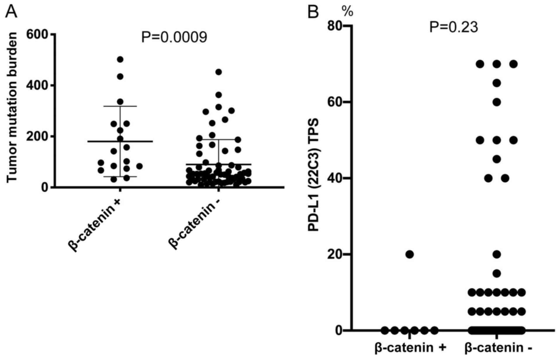 The median TMB was 142 (range, 32–502; n=17) in the β-catenin-positive group and 53 (range, 10–453; n=62) in the β-catenin-negative group. NSCLC-expressing β-catenin had a significantly higher TMB than non-β-catenin-expressing lung cancer (Fig. 4A). Conversely, NSCLC-expressing β-catenin tended to have a lower PD-L1 TPS compared with β-catenin-negative NSCLC (Fig. 4B). The median PD-L1 TPS was 0% (range, 0–20; n=7) in the β-catenin-positive group and 0% (range, 0–70; n=61) in the β-catenin-negative group.