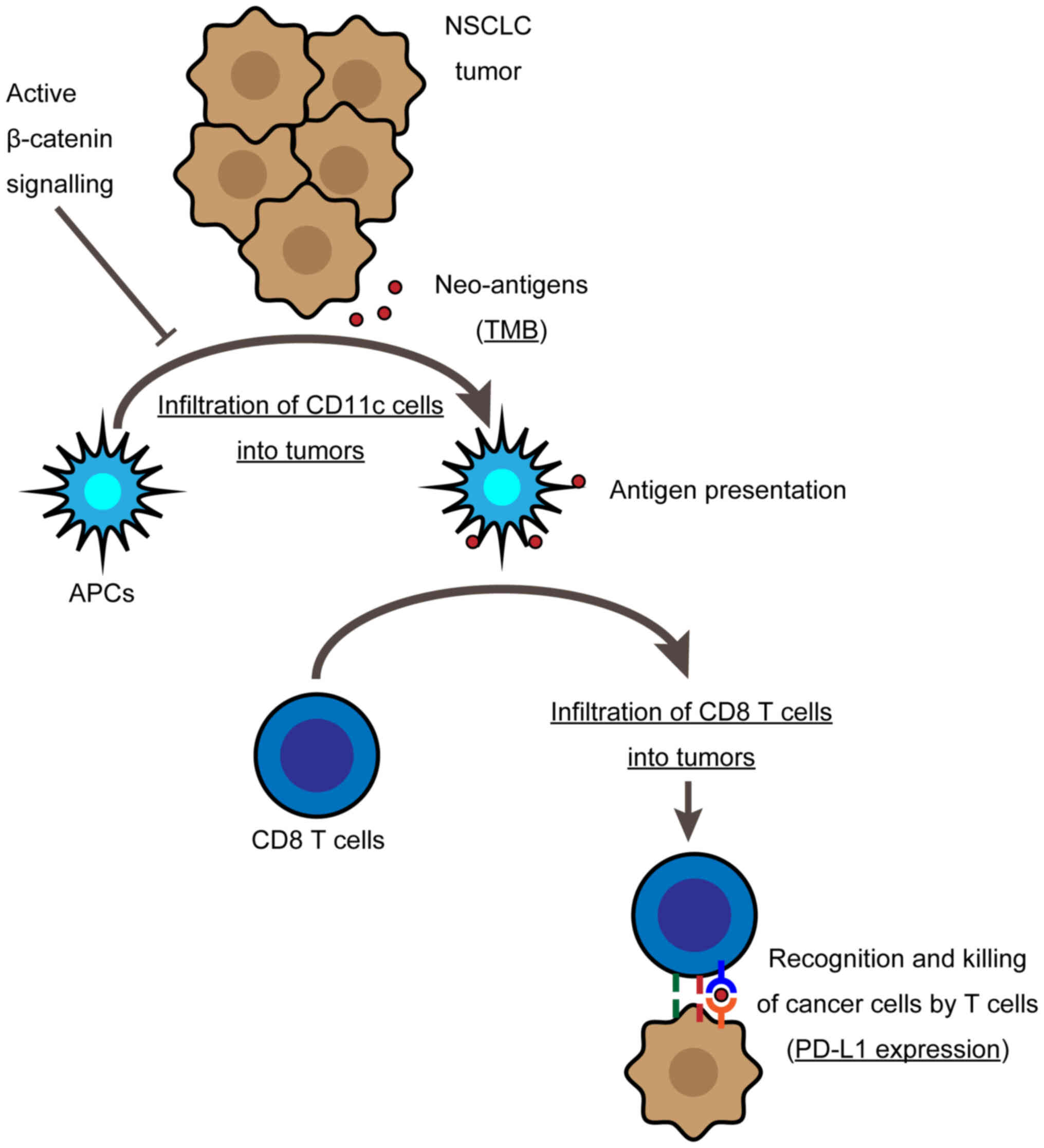 The present study investigated how β-catenin expression in NSCLC tumors influenced antitumor immune responses. It was found that β-catenin expression in tumors was negatively associated with TILs in NSCLC, which were associated with the suppression of CD11c+ cell recruitment. This result supports the findings of previous reports (12,13). Furthermore, to the best of our knowledge, the present study is the first to reveal that NSCLC-expressing β-catenin had high TMB, whereas PD-L1 TPS tended to be low. This suggests that NSCLC-expressing β-catenin might express numerous neo-antigens; however, there were few TILs, and IFN-γ production was low in the tumor microenvironment. The MYSTIC trial reported that history of smoking and squamous histology was associated with high TMB; however, PD-L1 expression status was not associated with TMB (33). This data also supports the result in the present study. Lung squamous cell carcinoma was reported to have a high TMB (34) and has a greater association with smoking history compared with lung adenocarcinoma. Therefore, it is likely that smoking history and squamous histology are associated with a high TMB. The present results suggest that IFN-γ produced by TILs is associated with PD-L1 expression in NSCLC. This indicates that NSCLC-expressing β-catenin prevents the cancer immune cycle from progressing, possibly by suppressing lymphocyte infiltration into tumor sites. Furthermore, an immune evasion mechanism might suppress antigen presentation by decreasing APC recruitment (Fig. 5).