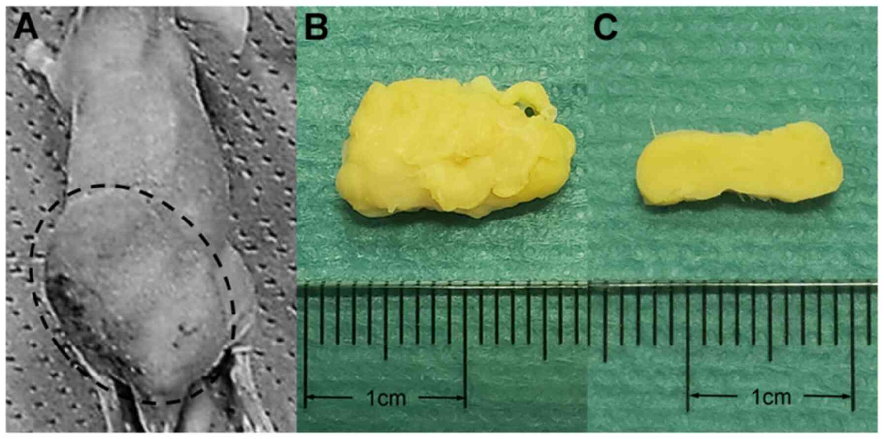 Male BALB/c nude mice [age, 5 weeks; body weight (mean ± standard deviation), 20.7±0.8 g] were obtained from CLEA Japan, Inc. The animals were housed under pathogen-free conditions in accordance with institutional principles. After one week, LM8 cells (1.0×106 cells in 500 µl PBS) were implanted into the dorsal subcutaneous area of the mice as previously described (Fig. 1) (14).