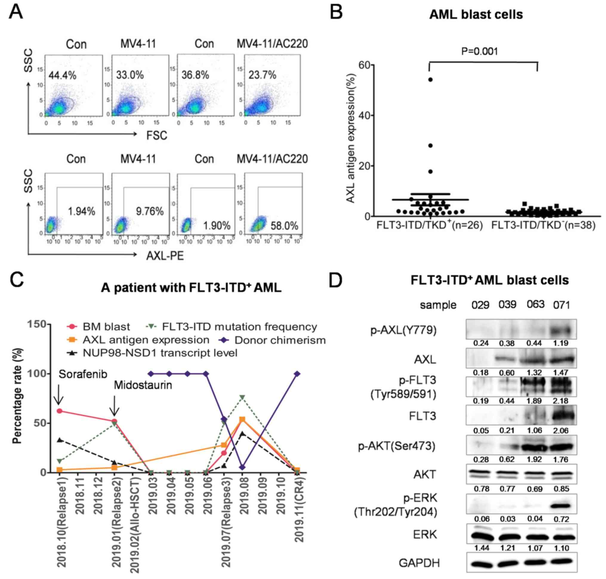 A 19-year-old male patient was diagnosed with FLT3-ITD+ AML (M4), and experienced three relapses and four complete remissions during clinical treatment between June 2018 and November 2019 (Fig. S2). The dynamic changes of AXL antigen expression in blast cells were consistent with the clinical resistance to the FLT3 inhibitors sorafenib and PKC412 (Fig. 1C). Western blotting was performed on AML blast cells and revealed that, with the upregulation of p-AXL, the downstream molecules p-AKT and p-ERK were also upregulated (Fig. 1D). These data suggested that increased AXL activation by FLT3 inhibitors may mediate resistance of leukemic cells in patients with FLT3-ITD+ AML.