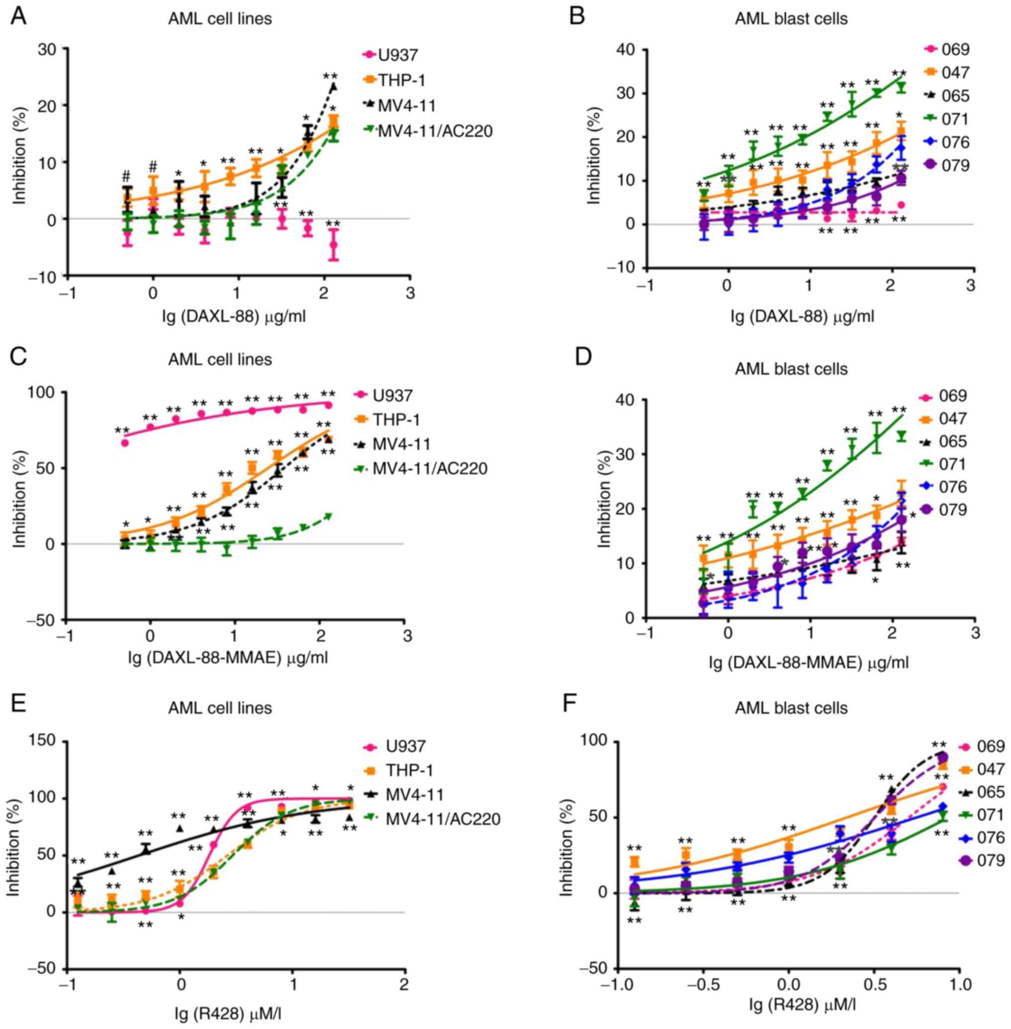 The human AML U937 (cat. no. TCHu-159), THP-1 (cat. no. TCHu-57) and MV4-11 (cat. no. SCSP-5031) cell lines were obtained from The Cell Bank of Type Culture Collection of the Chinese Academy of Sciences, where they were characterized by mycoplasma detection, DNA fingerprinting, isozyme detection and cell vitality detection. The Adriamycin (ADM)-resistant K562 cell line (K562/ADM) was kindly provided by Dr Ming Xiong, Central Laboratory of the People's Liberation Army Navy General Hospital (Beijing, China). Cell lines were cultured in RPMI-1640 medium (cat. no. SH30809.01; HyClone; Cytiva) supplemented with 10% FBS (cat. no. 1997802C; Gibco; Thermo Fisher Scientific, Inc.) and 100 U/ml penicillin-streptomycin at 37°C with 5% CO2. The AC220-resistant MV4-11 cell line (MV4-11/AC220) was generated by continuous incubation of the AC220-sensitive MV4-11 cell line with increasing doses of AC220. The MV4-11 cell line was started in culture in the presence of 0.1 nM AC220 for ~3 weeks. Between days 22 and 79, the concentration of AC220 was gradually increased from 0.1 to 1 nM. Between days 79 and 96, the concentration of AC220 was gradually increased from 1 to 5 nM. The cytarabine-resistant U937 cell line (U937/Ara-c) was generated by short-range shock induction of the cytarabine-sensitive U937 cell line with increasing doses of cytarabine (cat. no. H20160403; Actavis Italy SpA). The culture started in the presence of 0.8 µM cytarabine for 24 h. Subsequently, cytarabine was removed by centrifugation at 45 × g for 5 min at room temperature, and shock was repeated at double the dose after cell activity recovery up to a maximum induced dose of 300 µM. DAXL-88, DAXL-88-MMAE and IgG1-MMAE were produced by Dr Yanting Duan. PKC412 (cat. no. S8064), AC220 (cat. no. S1526), R428 (cat. no. S2841) and MMAE (cat. no. S7721) were purchased from Selleck Chemicals.