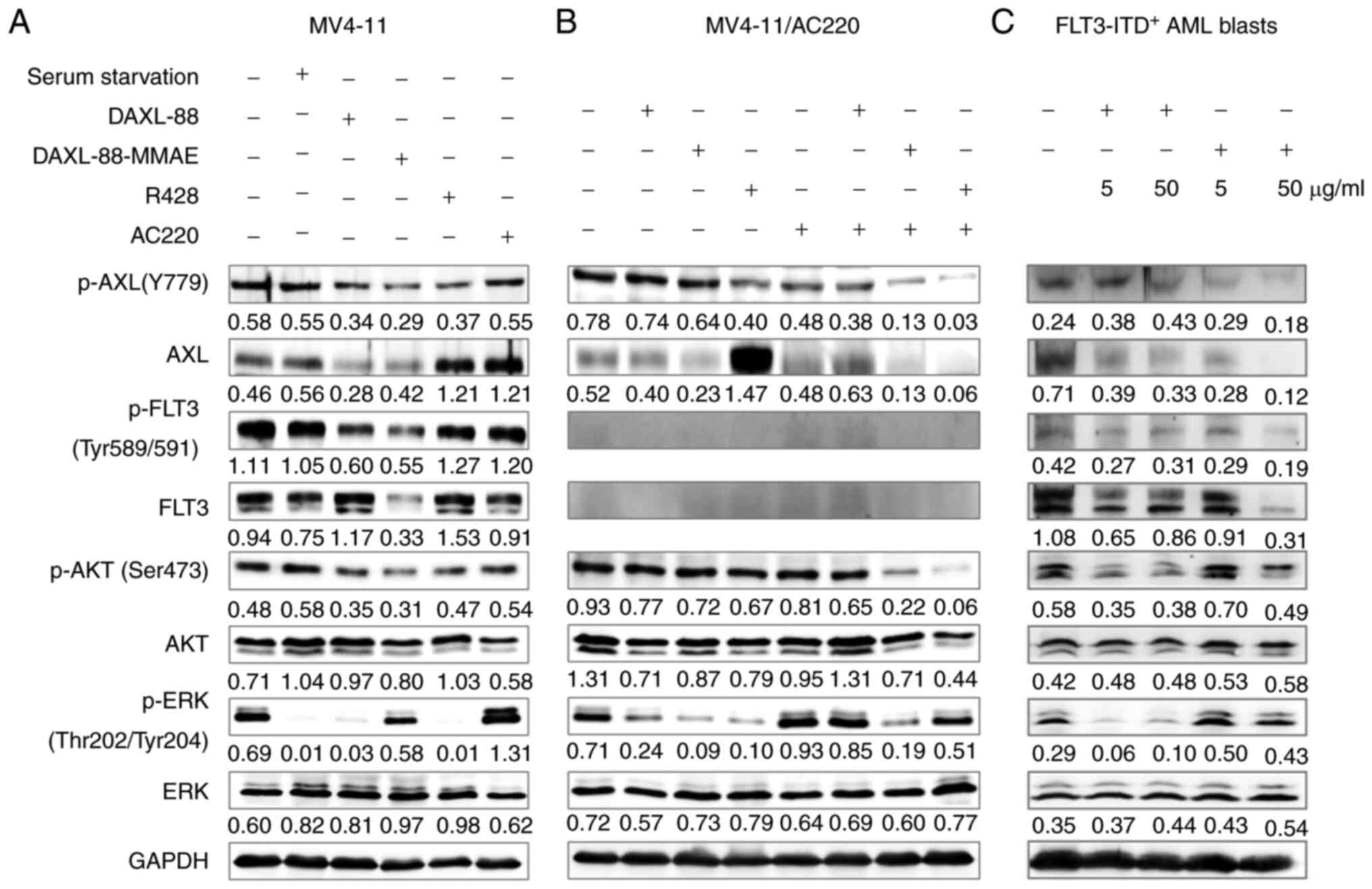 The anti-p-AXL antibody (Y799; cat. no. AF2228-SP) was obtained from BD Biosciences. Anti-AXL (cat. no. 8661), anti-p-FLT3 (cat. no. 3464), anti-FLT3 (cat. no. 3462), anti-AKT (cat. no. 4691), anti-p-AKT (cat. no. 4060), anti-ERK (cat. no. 4695) and anti-p-ERK (cat. no. 4695) antibodies were obtained from Cell Signaling Technology, Inc. MV4-11, MV4-11/AC220 and FLT3-ITD+ AML blast cells were collected and lysed in ice cold RIPA buffer (Beijing Solarbio Science & Technology Co., Ltd.) supplemented with protease inhibitor cocktail (Roche Diagnostics) for 30 min. Protein concentrations were quantified using a BCA kit (Applygen Technologies, Inc.). Proteins (25 µg/lane) were separated via 8% SDS-PAGE, transferred onto a nitrocellulose filter membrane (EMD Millipore) and blocked with 5% TBST skim milk for 1 h at room temperature. The nitrocellulose membrane was first incubated with primary antibodies against the aforementioned proteins at a dilution of 1:1,000 (except for anti-p-AXL which was used at a dilution of 1:200), overnight at 4°C, and then incubated with anti-rabbit secondary antibody conjugated to horseradish peroxidase (dilution, 1:5,000; cat. no. AS014; ABclonal Biotech Co., Ltd.) for 1 h at room temperature. An ImageQuant LAS4000 chemiluminescent imaging analyzer (GE Healthcare) was used for signal detection. GAPDH (cat. no. AC027; ABclonal Biotech Co., Ltd.) was used as a reference (13).
