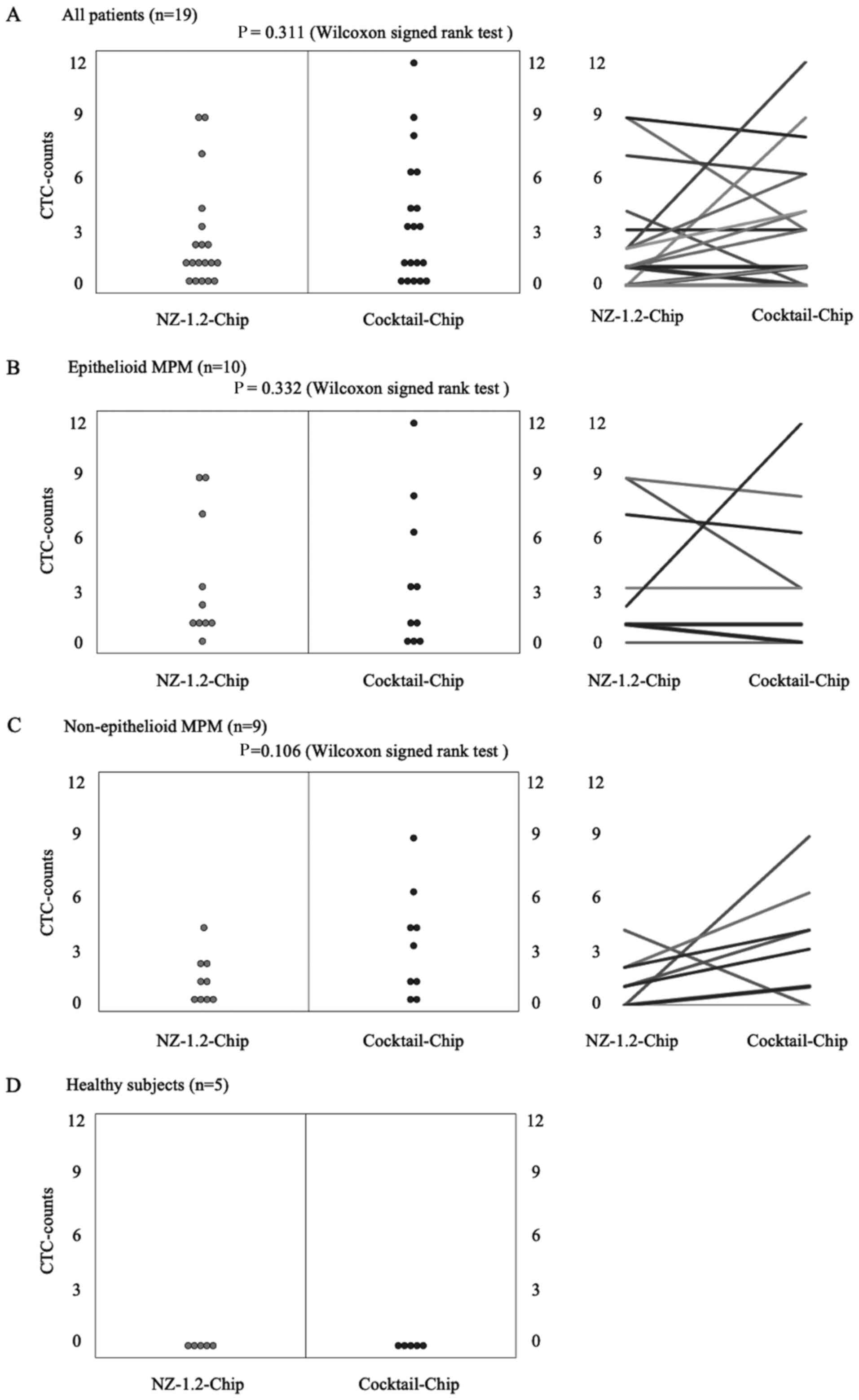 Representative images of immunofluorescent staining of CTCs captured using the Cocktail-chip in patients with malignant pleural mesothelioma are shown in Fig. 3. Fig. 4 shows the distribution of CTC-counts using the NZ-1.2- and Cocktail-chips for each sample. No cells were detected in the five healthy subjects, and no non-specific detection was observed (Fig. 4D). CTCs were detected in 73.7% of the samples (14/19 patients) with both the NZ-1.2- and Cocktail-chips. Furthermore, the NZ-1.2- and Cocktail-chips detected CTCs in 90 (9/10 patients) and 70% (7/10 patients) of samples with epithelioid MPM, and in 55.6 (5/9 patients) and 77.7% (7/9 patients) of samples with non-epithelioid MPM, respectively. No clusters, such as clusters of tumor cells or clusters of tumor cells and white blood cells, were observed. The median CTC-counts using the NZ-1.2- and Cocktail-chips were 1 (range, 0–9) and 3 (range, 0–12) in the overall population (P=0.311), 1.5 (range, 0–9) and 2 (range, 0–12) in epithelioid MPM (P=0.332), and 1 (range, 0–4) and 3 (range, 0–9) in non-epithelioid MPM (P=0.106), respectively. There was no significant difference between the two chips; however, the Cocktail-chip detected more CTCs in non-epithelioid MPM, suggesting it was more effective at detecting CTCs. In addition, the Cocktail-chip achieved a CTC-detection efficiency equivalent to that of the conventional NZ-1.2-chip in epithelioid MPM, that is there was no change in the number of epithelial cells (Fig. 4B).