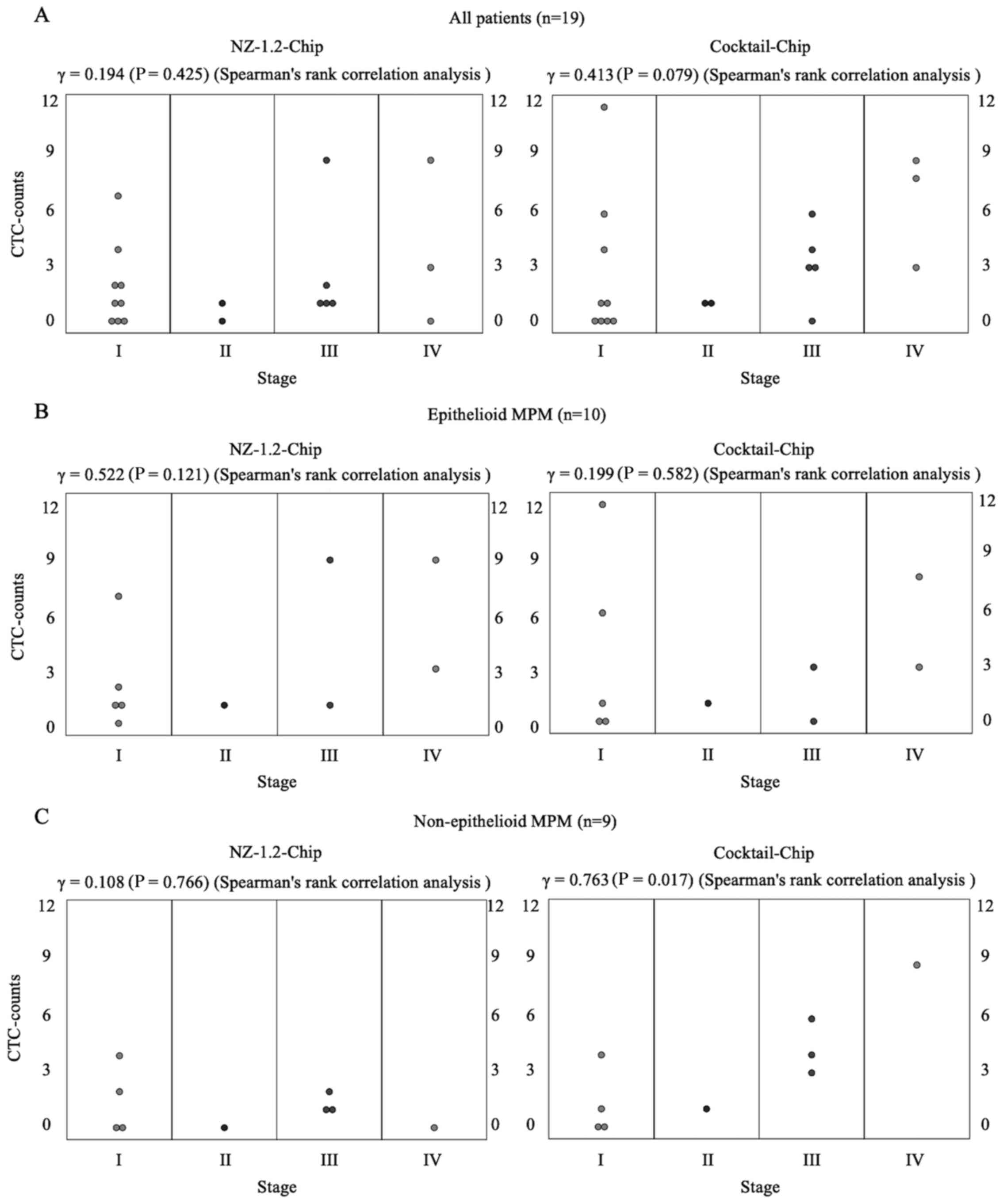 The correlation coefficient between CTC-counts and clinical stage in all patients was 0.194 (P=0.425) with the NZ-1.2-Chip and 0.413 (P=0.079) with the Cocktail-chip. Based on the histology data, the correlation coefficients in epithelioid and non-epithelioid MPM were 0.522 (P=0.121) and 0.199 (P=0.582) for CTC-counts with the NZ-1.2-Chip and 0.108 (P=0.766) and 0.763 (P=0.017) with the Cocktail-chip, respectively (Fig. 5). These data indicated that the CTC-counts using the Cocktail-chip were significantly correlated with the clinical stage of non-epithelioid MPM.