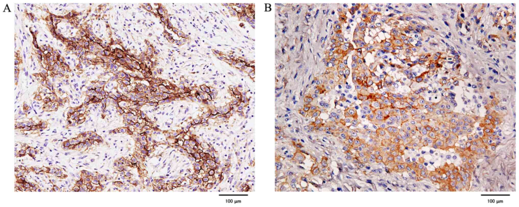 Serial 4-µm-thick sections were cut from each 10% formalin-fixed and paraffin-embedded primary tumor specimen collected by pleural biopsy or radical surgery, then evaluated using immunohistochemistry staining according to standard protocols. Sections were heated in 0.01 M citrate buffer (pH 6.0; cat. no. RM102-C; LSI Medience Corporation) at 98°C for 15 min for antigen retrieval and incubated in 3% hydrogen peroxide (cat. no. 081-04215; FUJIFILM Wako Pure Chemical Corporation) for 10 min to inactivate endogenous peroxidase. After blocking with Protein Block Serum-Free (cat. no. X090930-2; Agilent Technologies, Inc.) for 15 min, sections were incubated with mouse anti-podoplanin monoclonal antibody (clone D2-40; cat. no. 413451; pre-diluted antibody; Nichirei Biosciences, Inc.) and rabbit anti-EGFR monoclonal antibody (1:50 dilution; clone D38B1; cat. no. 4267S; Cell Signaling Technology, Inc.) for 1 h. Sections were then washed and incubated with Histofine Simple Stain MAX PO (MULTI) (cat. no. 424152; Nichirei Biosciences, Inc.) for 30 min. Thereafter, sections were visualized with DAB+ Liquid (cat. no. K346811; Agilent Technologies, Inc.) for 10 min and counterstained with hematoxylin for 1 min (cat. no. 30002; Muto Pure Chemicals Co., Ltd.). All steps after the antigen retrieval step were performed at room temperature.