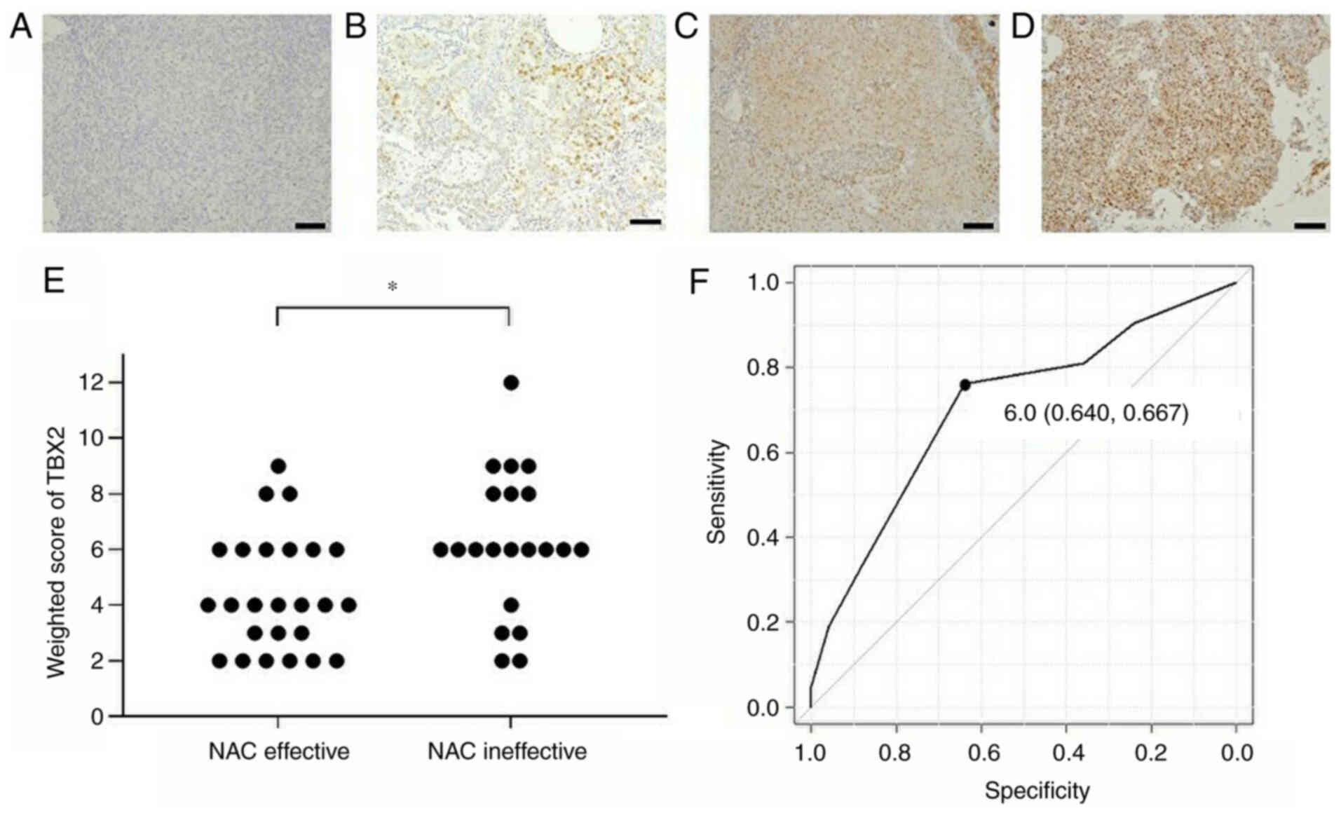 Statistical analysis was performed using EZR version 1.3 software (Saitama Medical Center, Jichi Medical University) (31). Values are expressed as the mean ± standard deviation. Statistically significant differences between groups were determined using unpaired Student's t-tests. Fisher's exact test was used to determine the association between categorical variables in the different patient groups. The Kaplan-Meier method and log-rank tests were used for survival analysis. Mann-Whitney U-tests were used to compare the IHC weighted scores. A receiver operating characteristic (ROC) curve was used to determine the cutoff value of TBX2 score to predict the effect of NAC treatment. P<0.05 was considered to indicate a statistically significant difference.