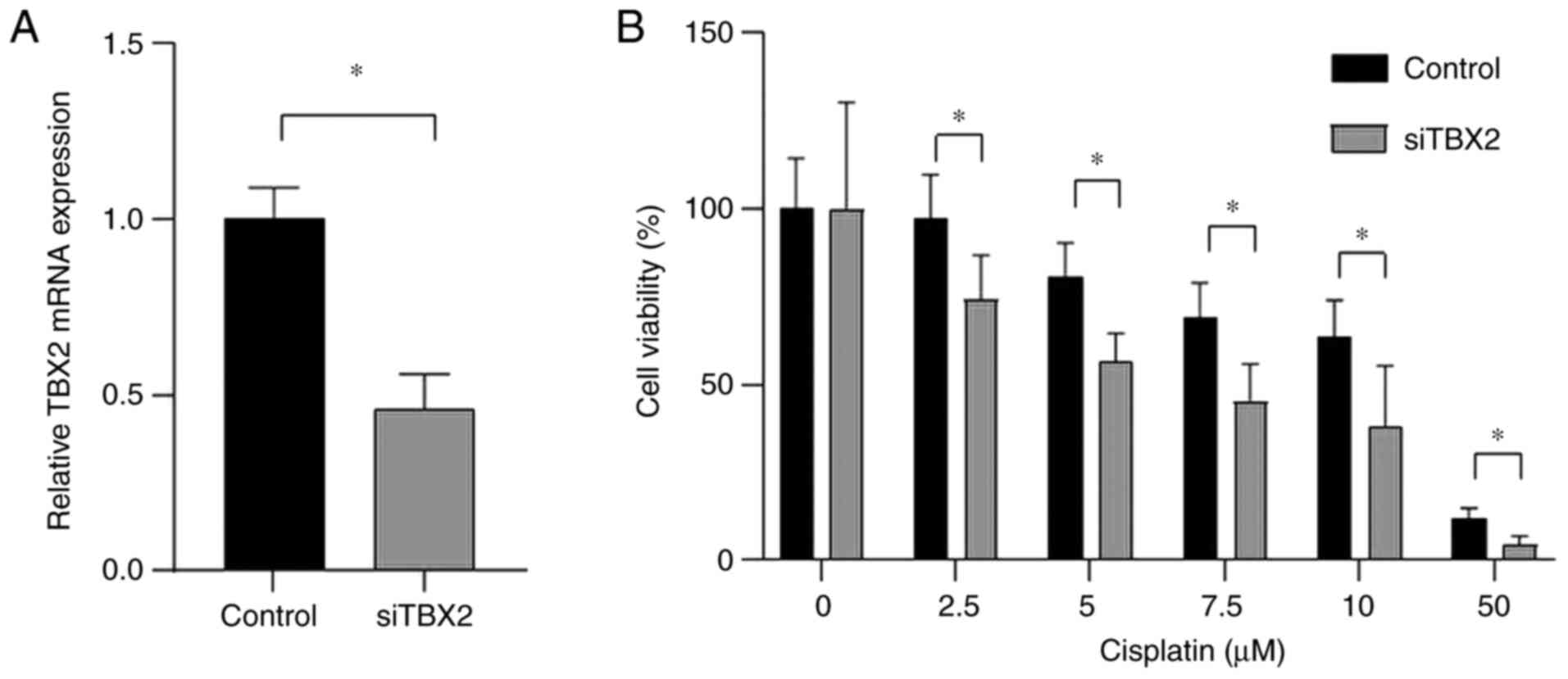 CaSki cells were seeded into 96-well plates (2×103 cells/well) and divided into two groups: i) Treated group, in which cells were transfected with TBX2-specific siRNA (customized siTBX2; Sigma-Aldrich; Merck KGaA); and ii) control group, in which cells were transfected with nontargeting siRNA (Mission® Universal Negative Control #1; cat. no. SIC001-10NMOL; Sigma-Aldrich; Merck KGaA). The siTBX2 sequence was as follows: Sense, 5′-CCAAUGAACUGCAGAGCAU[dT][dT]-3′ and antisense, 5′-AUGCUCUGCAGUUCAUUGG[dT][dT]-3′. siTBX2 transfections were performed using Lipofectamine® RNAiMax (Invitrogen; Thermo Fisher Scientific, Inc.) strictly following the manufacturer's protocol. After confirming cell adhesion in both groups, the control group was provided with fresh medium containing nontargeting siRNA transfection complexes, whereas the transfection group was treated with fresh medium containing siTBX2 transfection complexes. Following 24 h of incubation at 37°C, the cells in each group were incubated for an additional 48 h at 37°C in fresh medium containing 0, 2.5, 5.0, 7.5, 10 or 50 µM cisplatin. Cell viability was subsequently measured using a Cell Counting Kit (CCK)-8 assay (Dojindo Molecular Technologies, Inc.). In brief, 10 µl CCK-8 and 100 µl RPMI-1640 were added to each well, followed by incubation at 37°C for 2 h. The absorbance of each well was measured at a wavelength of 450 nm using a microplate reader (Corona Electric Co., Ltd.). The percentage of viable cells in comparison with the control cells was evaluated using dose-response curves.