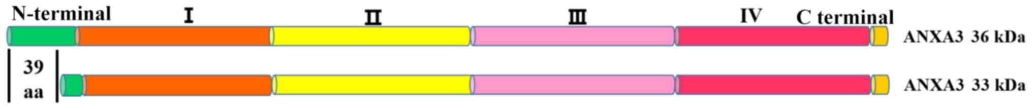 Figure 1.Diagram of the two isoforms of ANXA3. The 33 kDa and 36 kDa ANXA3 proteins. ANXA3 contains an N terminal, four annexin repeat domains (I–IV) and a C terminal. The 33 kDa isoform of ANXA3 lacks the first 39 amino acid residues of the N-terminal region, unlike the 36 kDa isoform. ANXA3, Annexin A3; aa, amino acids. |