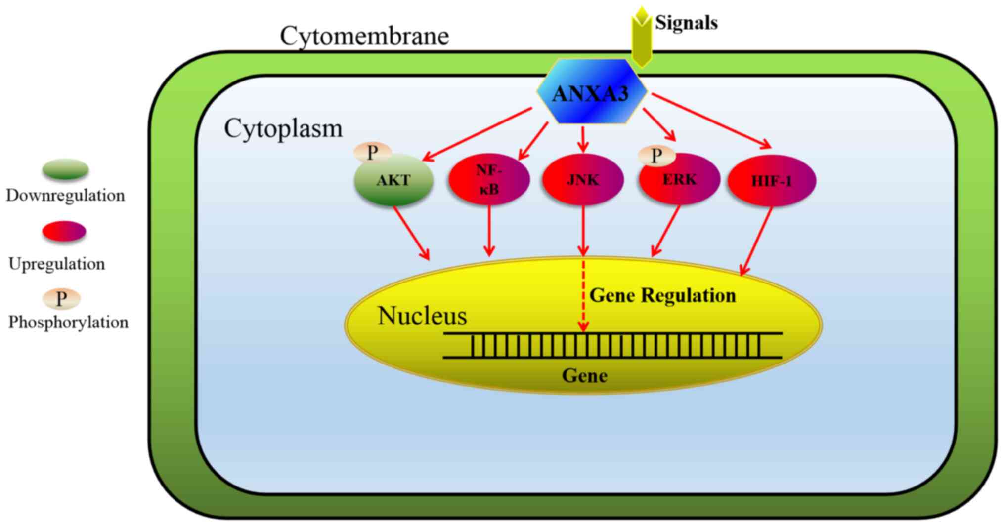 Figure 2.Signal transduction pathways by which ANXA3 exerts its role. ANXA3 exerts its role by regulating cell proliferation, migration and apoptosis by downregulating the PI3K/Akt signalling pathway and upregulating the NF-κB, JNK, ERK and HIF-1 signalling pathways. ANXA3, Annexin A3; PI3K, phosphatidylinositol-3 kinase; NF-κB, nuclear factor-κB; JNK, c-JUN N-terminal kinase; ERK, extracellular signal-regulated kinase; HIF, hypoxia-inducible factor. |