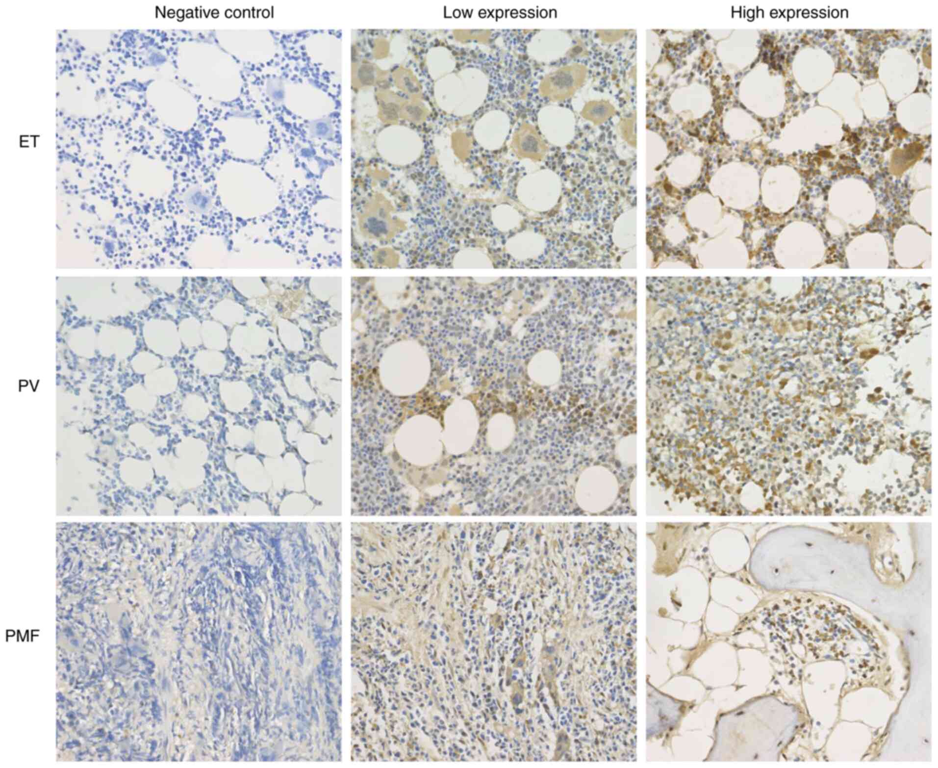 Figure 3.Representative immunohistochemical findings in all myeloproliferative neoplasm groups. Immunohistochemical analysis of sperm-associated antigen 6 expression was performed using paraffin-embedded bone marrow biopsy specimens. ET (upper panels), PV (middle panels) and PMF (lower panels). Negative control (left panels), low expression (center panels) and high expression (right panels). Magnification, ×400. ET, essential thrombocythemia; PMF, primary myelofibrosis; PV, polycythemia vera. |