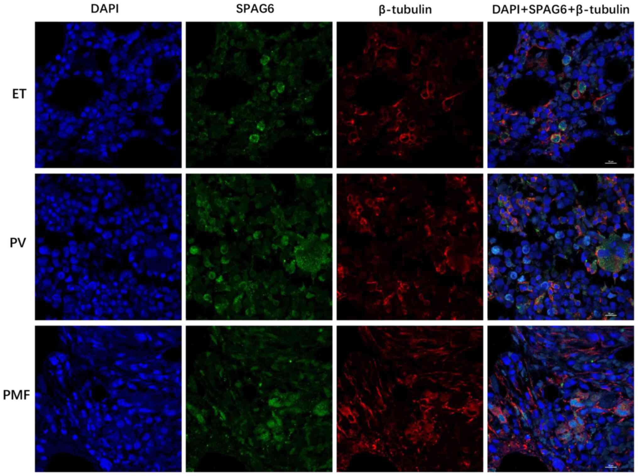 Figure 6.Double immunofluorescence staining of SPAG6 and β-tubulin expression in bone marrow biopsy specimens from patients with myeloproliferative neoplasms. ET (upper panels), PV (middle panels) and PMF (lower panels). Green fluorescence represents SPAG6 staining and red fluorescence represents β-tubulin staining. Blue staining is DAPI nuclear stain. Merged images (right panels; DAPI + SPAG6 + β-tubulin). Original magnification, ×1,000. ET, essential thrombocythemia; PMF, primary myelofibrosis; PV, polycythemia vera; SPAG6, sperm-associated antigen 6. |