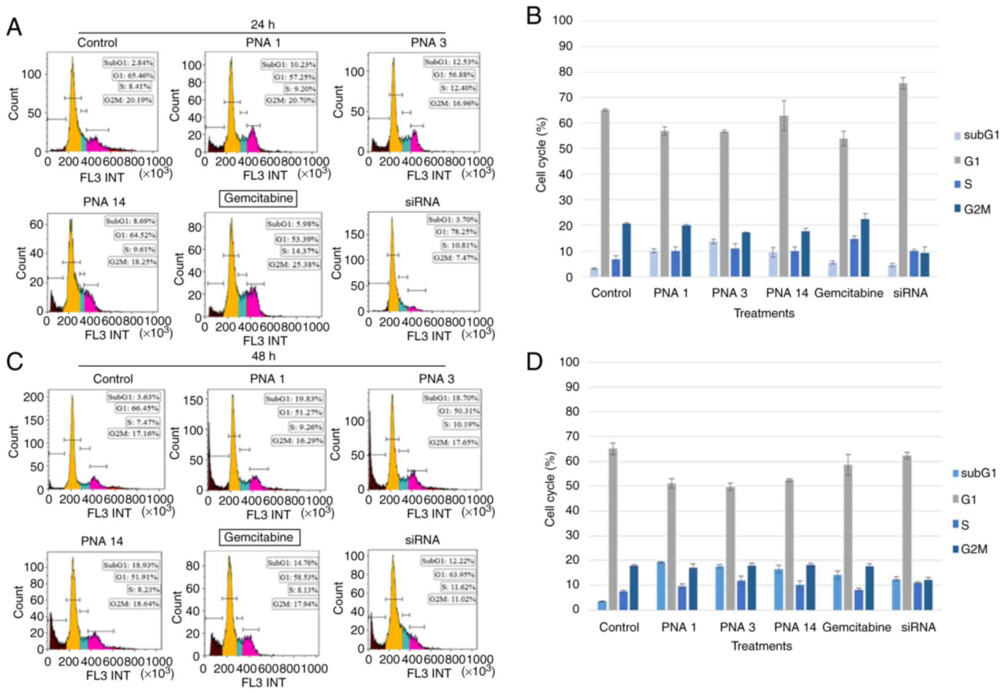 PNA binding to the mutated KRAS gene may cause cell-cycle arrest and cell apoptosis (an increase in the number of cells in the sub-G1 phase). To assess this possibility, AsPC-1 cells were treated with 2 µM of PNAs for 24 and 48 h and incubated with propidium iodide (PI) to determine the DNA content, which reflects the cell number. PI signals were then read using a flow cytometer, and the data were analyzed using Kaluza Software. Gemcitabine (20 µM) and siRNA specific to the mRNA sequence of the mutant KRAS gene (20 µM) served as positive controls. The results, which are presented in Fig. 4, show that, compared to the two positive controls, the PNAs induced apoptosis (an increase in the number of cells in the sub-G1 phase), and the number of cells in the G1 phase decreased.