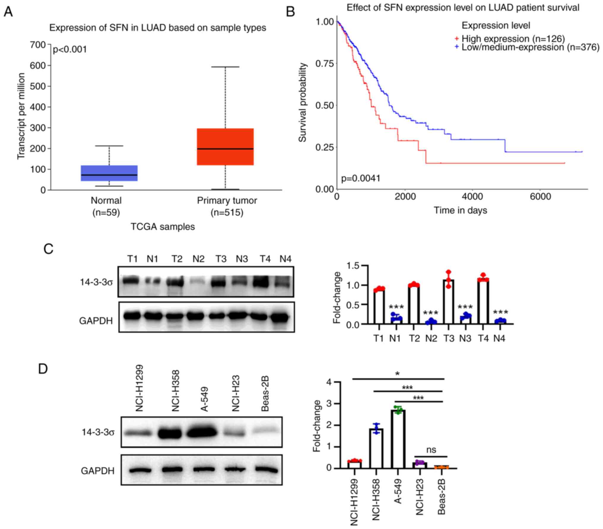 To detect the protein level of 14-3-3ơ in LUAD tissue, a total of four LUAD tissue samples and non-tumor adjacent tissues samples were derived from biopsy samples and pathologically confirmed as LUAD from December 2020 to August 2021. Specific information on the patients is provided in Table I. The present study was performed according to the Declaration of Helsinki and approved by Ethics Committee of the People's Hospital of Beilun District [Ningbo, China; no. 2021-23(YS)]. Each patient provided written informed consent prior to surgery.