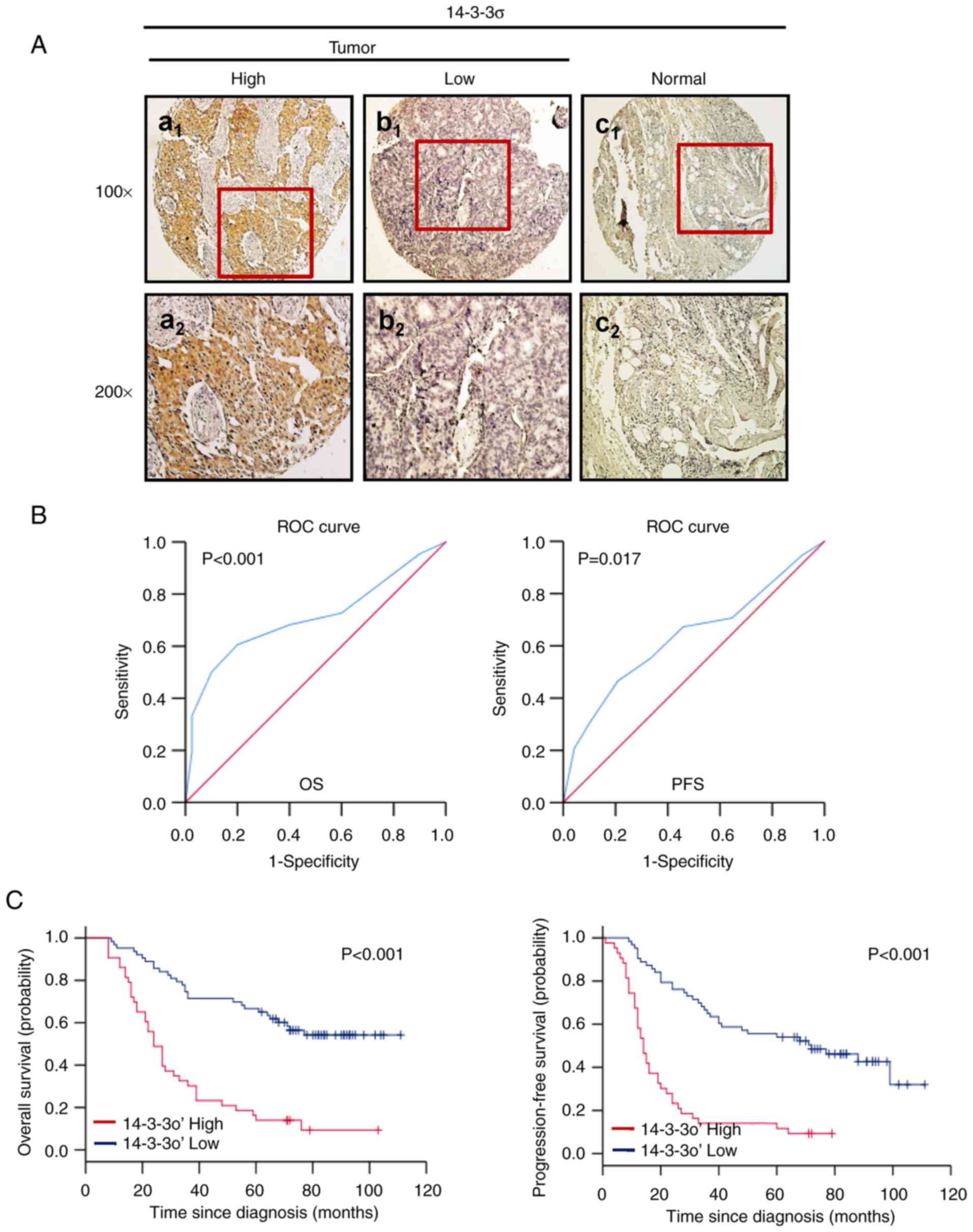The 14-3-3 protein family consists of at least seven isoforms, namely β, γ, ε, η, ξ, σ and τ/θ, which are present in mammalian cells (9). 14-3-3 proteins are involved in a variety of cell signal transduction processes, such as cell proliferation, cell cycle regulation, apoptosis and malignant transformation (10,11). In the 14-3-3 protein family, 14-3-3σ is most associated with tumor occurrence and development (12). 14-3-3ơ was originally identified as a human mammary epithelium marker 1 and as a tumor suppressor gene (13,14), which was determined to be reduced or lost in numerous types of solid tumor (15). Loss or reduction of 14-3-3σ by CpG methylation or p53 mutation contributes to the progression of different types of carcinomas, including early stages of tumor development (16–21). This suggests that the function of 14-3-3σ may help prevent the malignant transformation of epithelial cells. However, a growing body of evidence suggested that 14-3-3σ does not act as a tumor suppressor in cancers. Enhanced 14-3-3σ has been observed in pancreatic cancer (22), gastric carcinomas (23) and prostate cancer (24), and which is positively associated with aggressive tumor behavior and poor prognosis (15,25,26). Therefore, the biological role of 14-3-3ơ in tumorigenesis and progression of human cancers varies according to the specific tumor type.