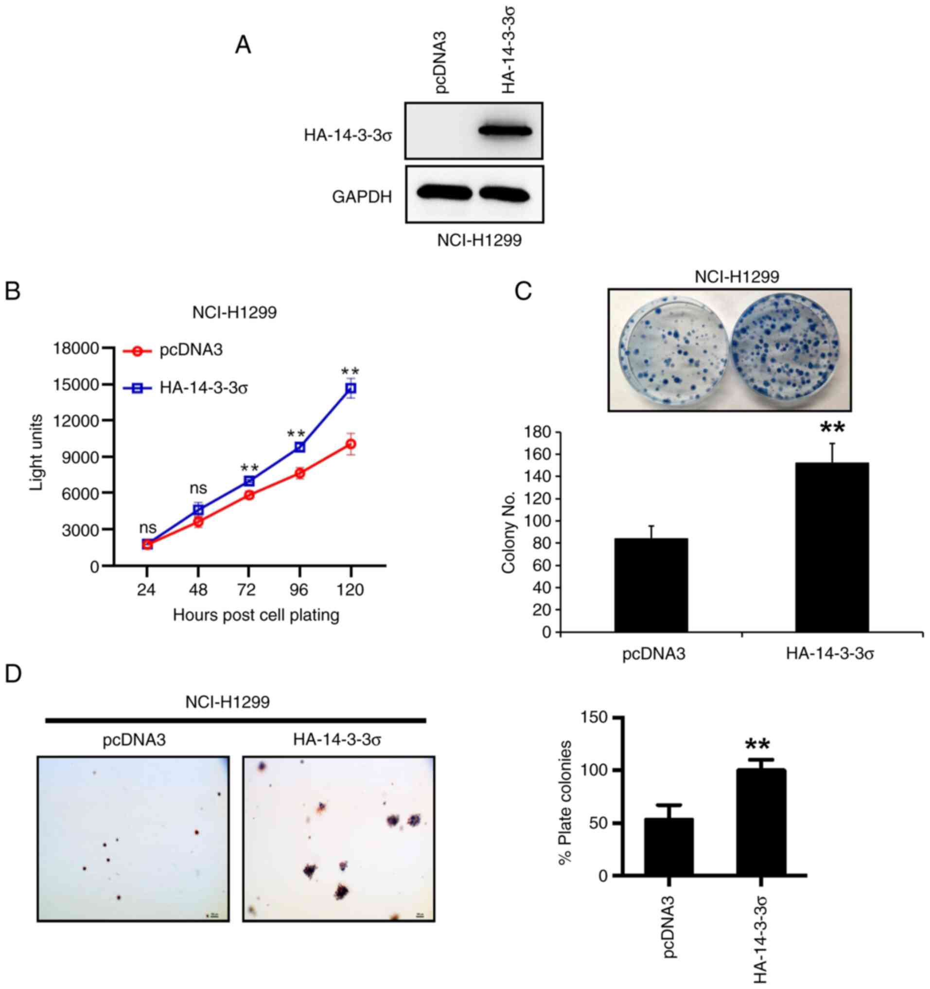 The above results suggested that high expression of 14-3-3σ was associated with progression and poor prognosis of LUAD. Thus, the biological function of 14-3-3σ in LUAD was further investigated in vitro. First, 14-3-3σ plasmid was transfected into NCI-H1299 LUAD cells (Fig. 3A), as the native cell line expressed 14-3-3σ at a low level (Fig. 1D), and it was indicated that overexpression of 14-3-3σ promoted cell proliferation and survival, as measured by ATP-lite (Fig. 3B) and colony formation assays (Fig. 3C), respectively. Furthermore, the anchorage-independent growth of NCI-H1299 cells, measured by the soft agar assay, was increased upon 14-3-3σ overexpression (Fig. 3D). Thus, 14-3-3σ appeared to have growth-promoting activity in LUAD cells.
