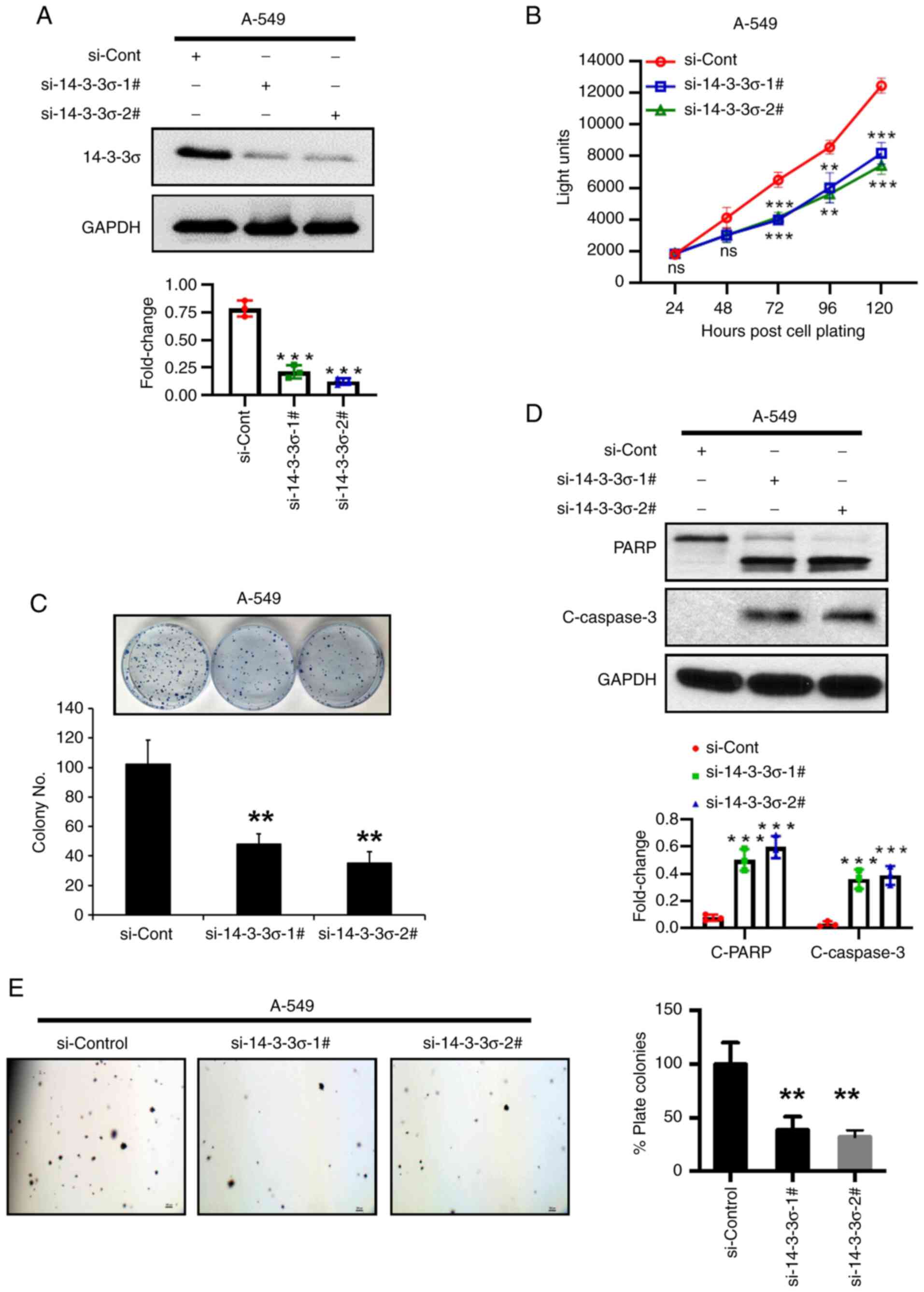 To further validate 14-3-3σ as an oncogene for LUAD, siRNA-based knockdown experiments were performed in A-549 LUAD cells, as the native cell line has high expression of 14-3-3σ (Fig. 1D). The results indicated that 14-3-3σ depletion suppressed cell proliferation and the colony-forming ability of the cells (Fig. 4A-C). The nature of survival inhibition upon 14-3-3σ depletion was demonstrated to be induction of apoptosis, as evidenced by an increase in PARP cleavage and Caspase-3 cleavage (Fig. 4D). Furthermore, the anchorage-independent growth of A-549 LUAD cells was inhibited by up to 60% on 14-3-3σ depletion (Fig. 4E). Thus, growth suppression upon 14-3-3σ depletion may be mediated via apoptosis induction.