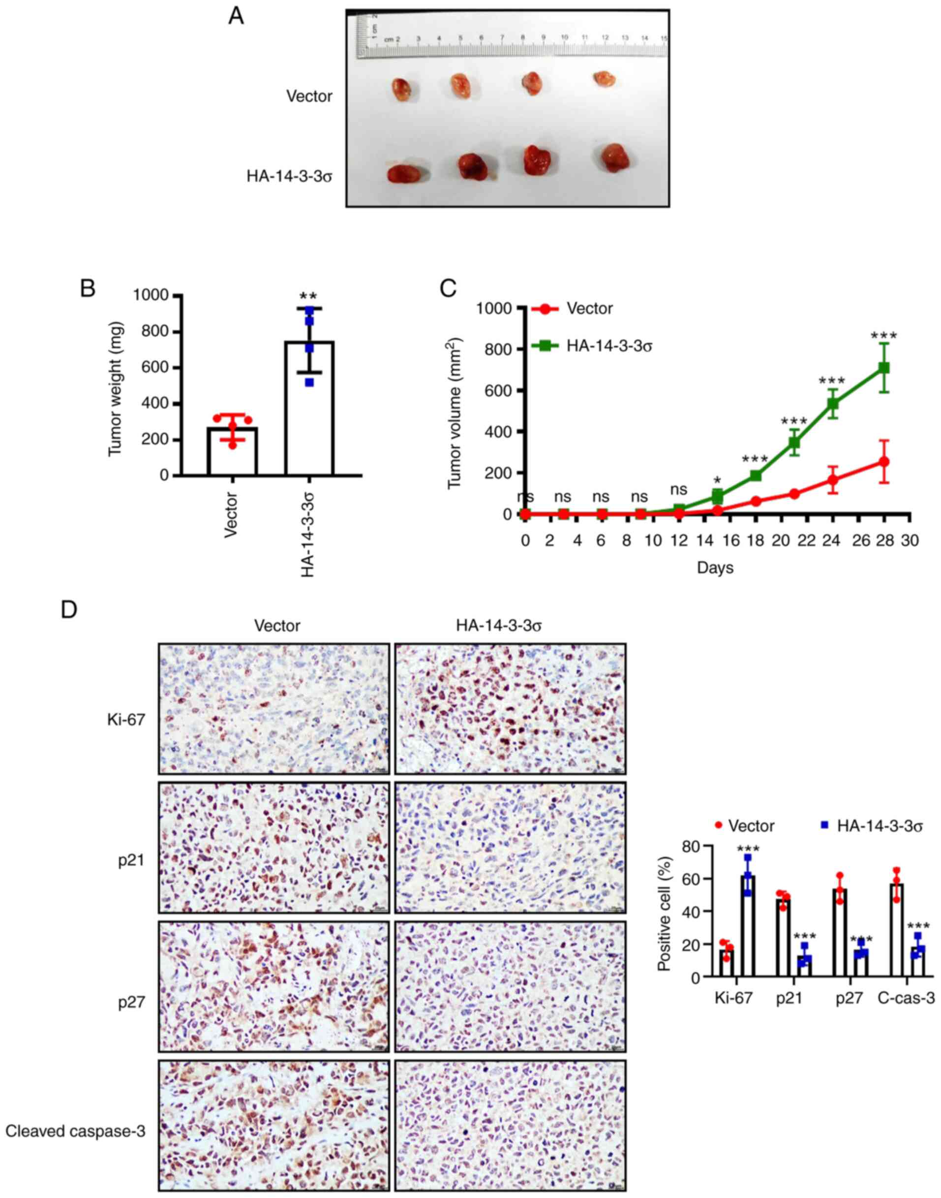 Next, the above in vitro findings were validated in a xenograft model. NCI-H1299 cells with stable overexpression of 14-3-3σ were inoculated into the right flank of nude mice and, as expected, overexpression of 14-3-3σ profoundly promoted tumor growth in vivo, increasing the tumor size and weight compared to the vector control (Fig. 5A-C). Likewise, IHC staining of tumor tissues also revealed that overexpression of 14-3-3σ markedly promoted tumor growth (increase of Ki-67 and decrease of p21 and p27) and inhibited apoptosis (decrease of cleaved-Caspase-3) (Fig. 5D). Collectively, the results of the in vitro cell experiments and in vivo xenograft models consistently demonstrated that overexpression of 14-3-3σ significantly promoted the growth of LUAD. At the same time, clinical data analysis also confirmed that 14-3-3σ high expression was positively correlated with poor prognosis of patients with LUAD.