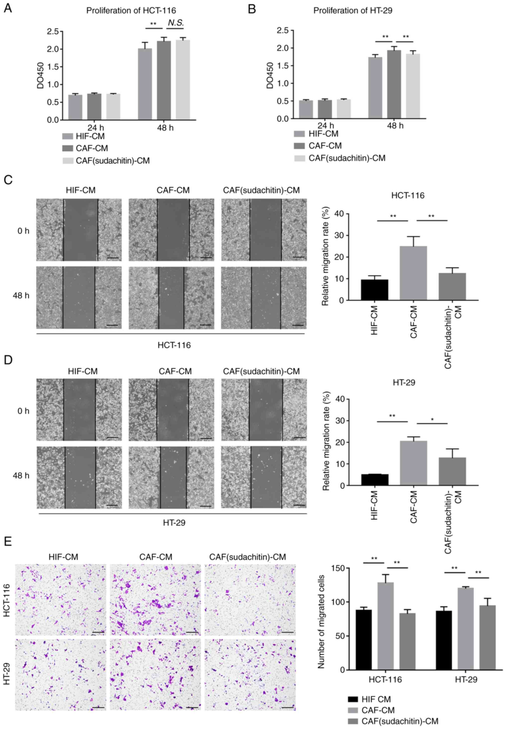 To generate CAFs, HIFs were co-cultured for 3 days with HCT-116 or HT-29 cells at a ratio of 1:3 using Falcon permeable supports for six-well plates with 0.4-µm pores (353090; Corning, Inc.), which provided indirect contact between cell types but used the same DMEM medium containing 10% FBS as we described in our previous study (10). For generating CAF (sudachitin), CAFs were further treated with 50 µM sudachitin for 24 h. Total RNA samples for quantitative real-time reverse transcription PCR (qRT-PCR) in each group were extracted in this step. To generate CM, the medium was further changed by fresh serum-free DMEM and continued to incubate cells for 48 h. Then the supernatants were collected, centrifuged (500 × g) at room temperature for 20 min, and filtered through 0.2-µm filter membranes to remove cellular debris. The supernatants were named as CAF-CM in CAFs group, CAF (sudachitin)-CM in CAFs (sudachitin) group and HIF-CM in HIFs group, respectively. As shown via flow charts (Fig. S1A-C). The CM from each of the above groups was stored at −80°C and avoid repeated freezing and thawing. For treatment of cancer cells in the subsequent experiments, the CM was warmed to room temperature and added to fresh DMEM medium at a ratio of 1:1, which will include the soluble factors in the CM and supply enough nutrients to support the cells for the next experiment. The final FBS concentration were varies according to the different experiments and details were mentioned in each of the experiments.