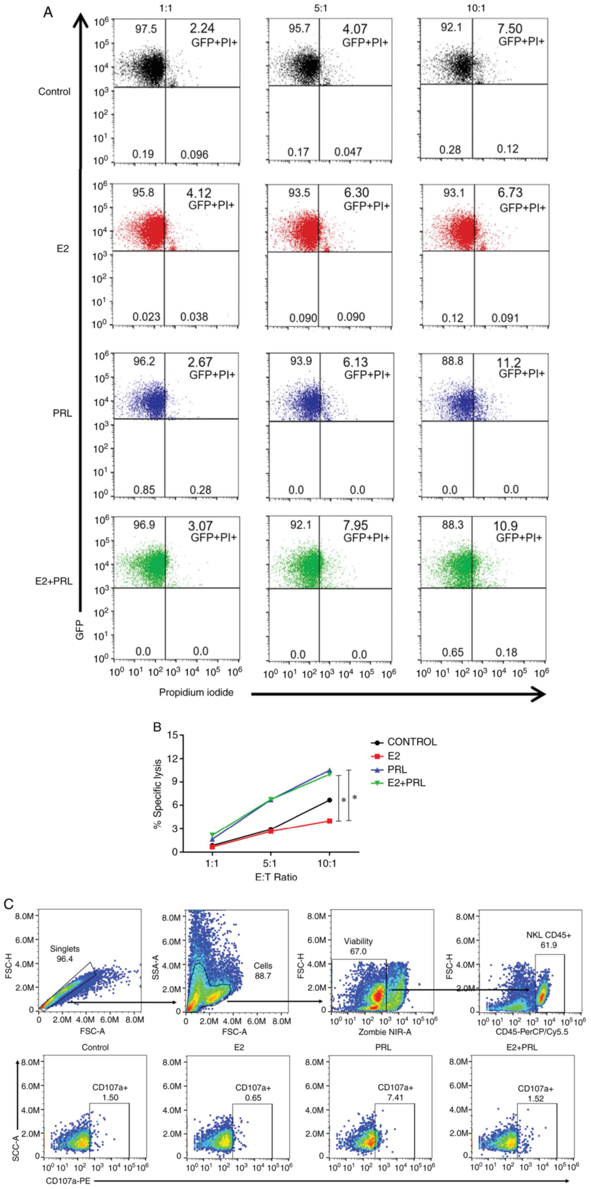 To evaluate the effect of hormones on NK cell-mediated cytotoxicity, NKL cells were stimulated with E2 (10 nM) or PRL (200 ng/ml) either alone or in combination for 48 h and subsequently co-cultured with GFP-K562 cells at various E:T ratios (1:1, 5:1 and 10:1) for 4 h. The identification of dead target cells was characterized as GFP+PI+ by flow cytometric analysis (Fig. 1A).