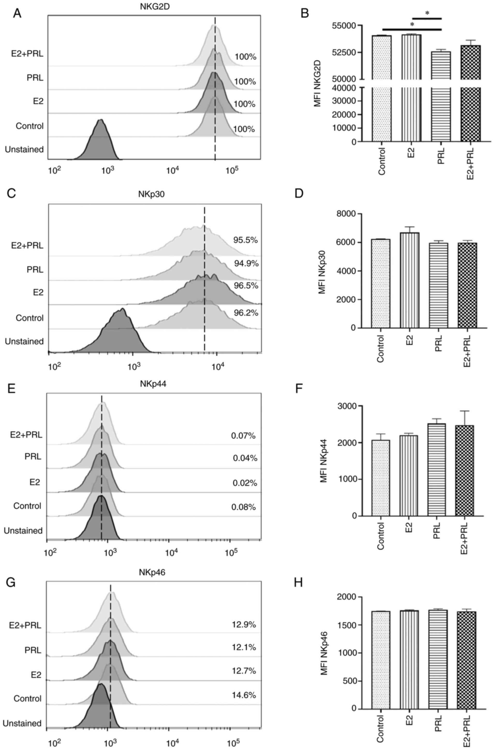 Subsequently, the present study aimed to evaluate whether the differences in the cytotoxicity of NKL cells by hormones may be attributed to changes in the expression of activation receptors, including NCR and NKG2D. The data obtained did not indicate that these effects were related to the NCR, since it was observed that the hormones did not modify the expression of NKp30, NKp44 and NKp46. By contrast, it was observed that PRL may decrease the expression of NKG2D in NKL cells. This is in line with a previous study by Ma et al (71) in 2010, where it was demonstrated that the expression of NKG2D may decrease in T lymphocytes from patients with prolactinoma.
