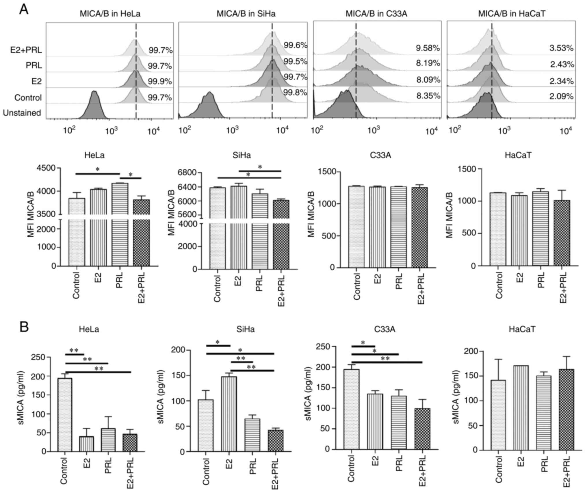 When the change in the expression of NKG2D by these hormones was observed, it was decided to evaluate MICA and MICB ligands of this receptor, which are expressed in the membrane, as well as in soluble forms. MICA and MICB are known as stress proteins and these ligands have been reported to be elevated in CC patient biopsies and to be also overexpressed in CC-derived cell lines, including SiHa, HeLa, CALO and INBL (45,54,71). The results of the present study are consistent with the findings from the study by del Toro-Arreola et al (45), with MICA/B being expressed mainly in HaCaT, C33A, HeLa and SiHa cells. Furthermore, sMICA was detected in cell supernatants at relatively similar levels. Of note, it was demonstrated that PRL may increase MICA/B expression on the HeLa cell surface, while decreasing sMICA release in the supernatant of all CC-derived cells. In the context of the interaction that exists in the CC microenvironment, the increase in cytotoxicity which was observed under the effect of PRL may be explained by the increase in MICA/B in the membrane, which can bind to NKG2D; this is also supported by the decrease in sMICA. To the best of our knowledge, there no studies available to date that relate the effect of PRL with the release of MIC molecules. However, it has been revealed that metalloprotease 9, which has the ability to cleave MICA, decreases its expression due to the effects of PRL, possibly explaining the aforementioned result (72,73). By contrast, in the present study, E2 decreased sMICA in HeLa and C33A cells, whereas an opposite effect was observed in SiHa cells, possibly indicating that the effects of E2 vary depending on the cell type. Although an effect of E2 on MICA/B surface expression, when stimulating the cells with both hormones was not detected, it was observed that sMICA expression decreased in all CC-derived cell lines. This may indicate that the joint effect of the hormones may be related to the increase in the cytotoxicity of NKL cells and also supporting the regulatory effect of one hormone on the other.