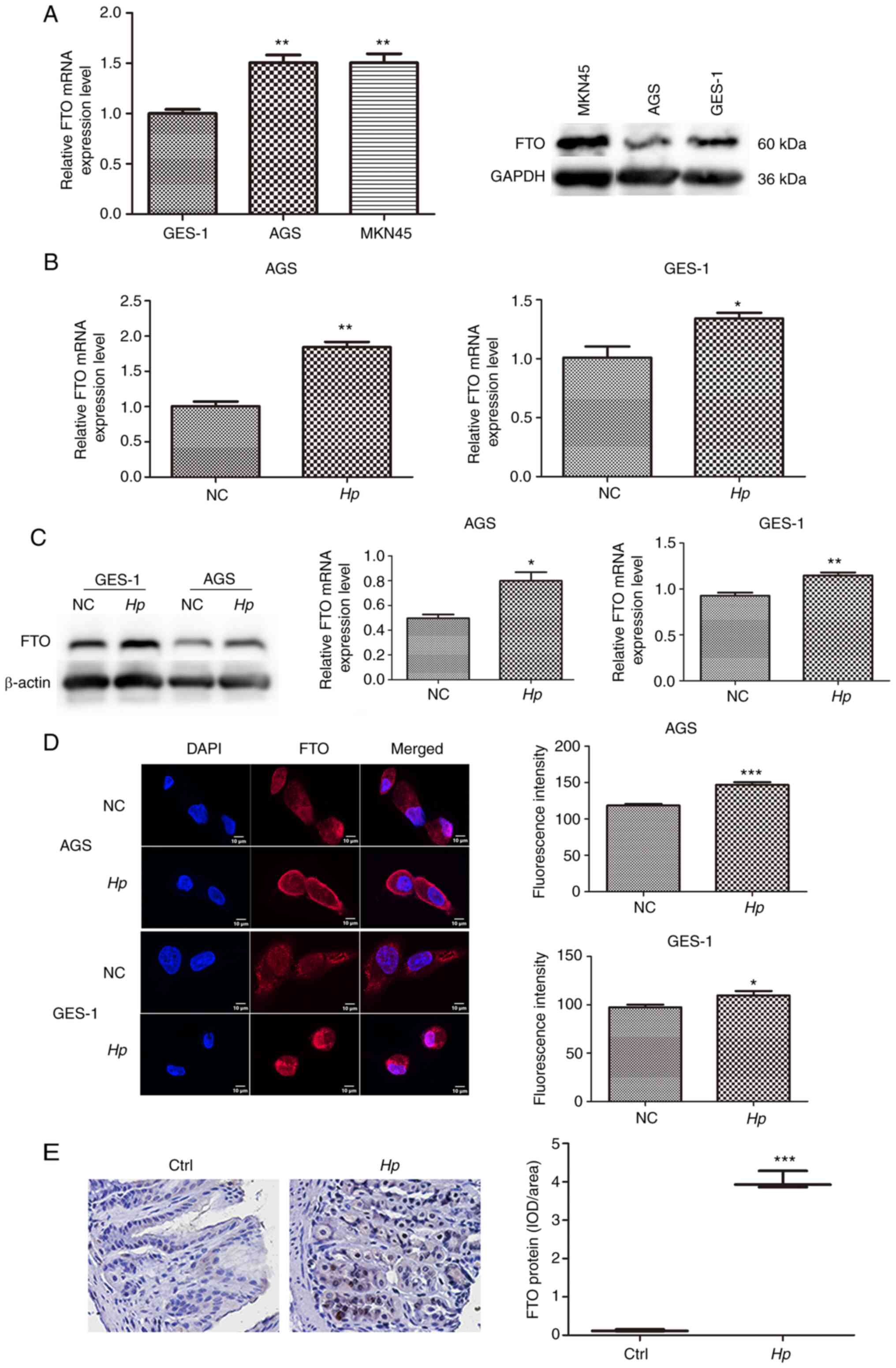 In previous research by our group, Hp-CagA transfected gastric cancer cells were used for transcriptome sequencing and it was found that the expression of FTO mRNA was increased (38). It was speculated that Hp may play a role in the development and progression of gastric cancer by increasing FTO expression. In the present study, gastric epithelial cells were infected with Hp and an increase in FTO mRNA and protein levels were observed, compared with uninfected cells. Using immunofluorescence, it was also observed that Hp infection increased the level of FTO protein. These findings were further confirmed using a gerbil model. These results add to the hypothesis that FTO may play an important role in Hp-related gastric cancer.