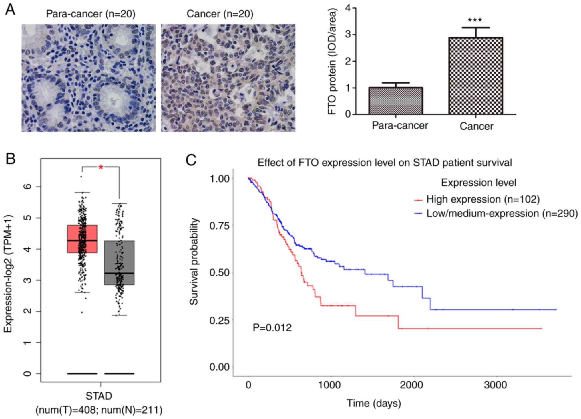 In the present study, using immunohistochemistry on 20 gastric cancer and adjacent tissue sections, it was observed that the expression level of FTO in human gastric cancer tissue was higher than that in adjacent normal tissues. The analysis using the TCGA database also demonstrated that patients with gastric cancer had a higher expression level of FTO than the controls. Survival curve analysis showed an association between a high expression level of FTO and poor survival rate of patients with gastric cancer. Altogether, these data suggest a role of FTO in the occurrence of gastric cancer. A comparison of clinicopathological parameters in patients with gastric cancer with high and low FTO expression levels indicated a statistically significant association between FTO expression and T stage, M stage and AJCC stage, but no association with age, sex or N stage. These results were consistent with the research of Xu et al (14).