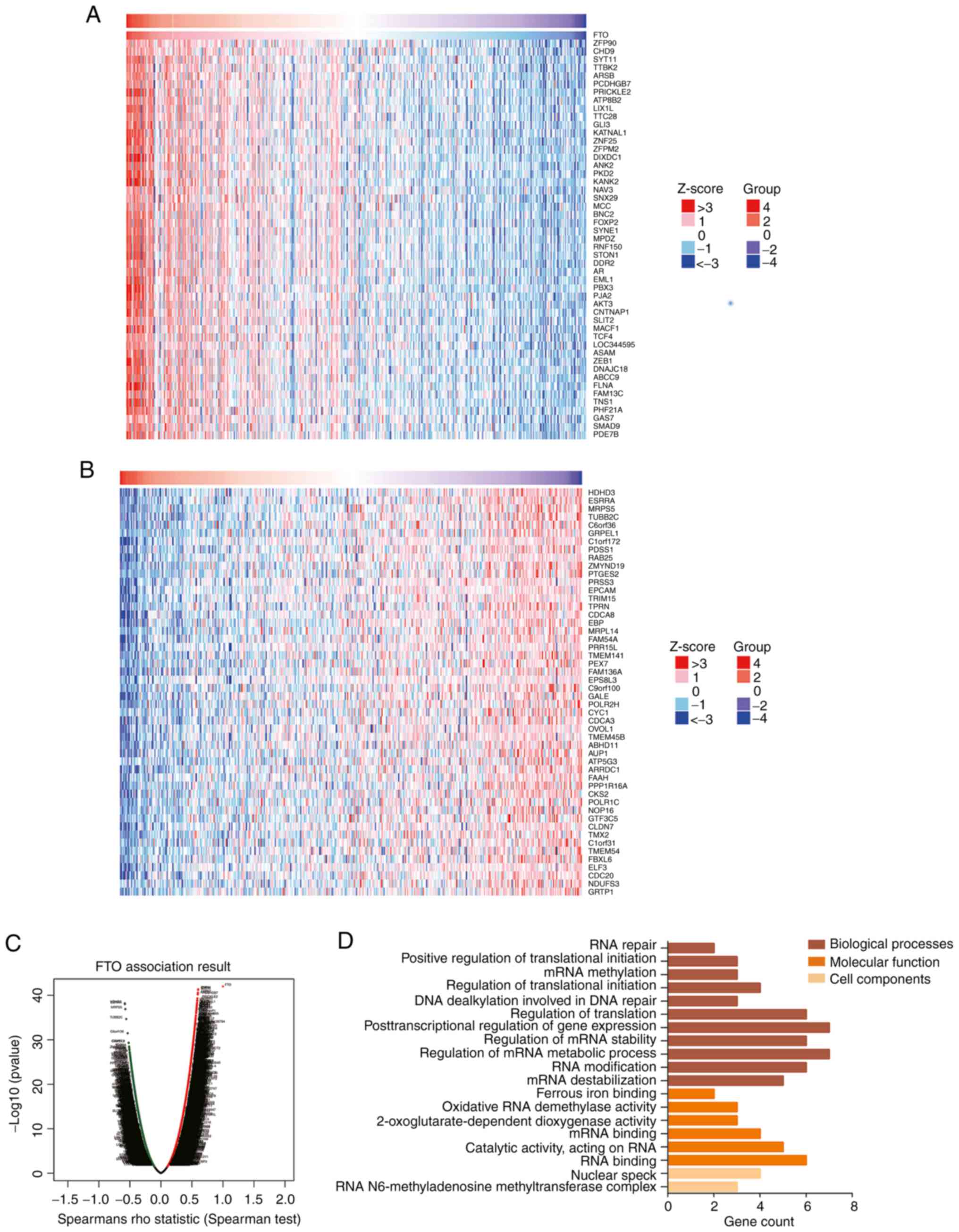 The LinkedOmics database was used to analyze genes related to FTO in patients with gastric cancer, based on Spearman's correlation test. The FTO gene in gastric cancer was positively correlated with 16,601 genes, including ZFP90, chromodomain helicase DNA binding protein 9 (CHD9) and protocadherin γ subfamily B7 (PCDHGB7) (Fig. 3A), and was negatively correlated with 3,623 genes, including halo acid dehalogenase like hydrolase domain containing 3 (HDHD3) and estrogen related receptor α (ESRRA) (Fig. 3B). GO enrichment demonstrated that RNA stability and RNA metabolism were the biological processes in which FTO related genes were most significantly enriched during gene expression regulation (Fig. 3D). The molecular functions of FTO-related genes that were most significantly enriched were oxidative RNA demethylase activity and mRNA binding. The cellular components most significantly enriched were the RNA m6a methyltransferase complex and nuclear speckles. The enrichment results of FTO-related genes suggest a possible function for FTO in cell proliferation and metabolism and a role in the tumorigenesis and progression of gastric cancer.