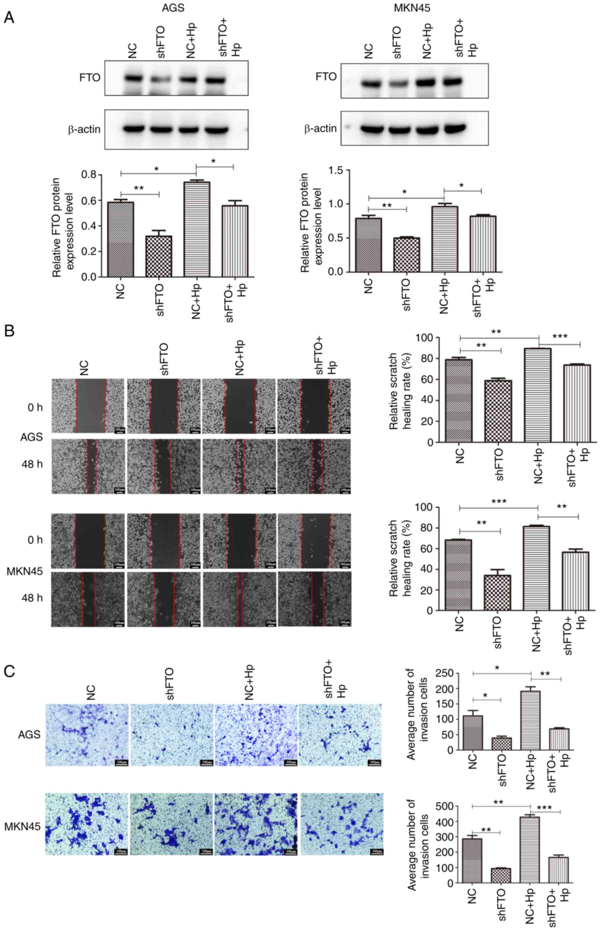 To the best of our knowledge, there are currently no published data determining whether Hp infection affects FTO expression in gastric cancer. Therefore, the present study aimed to investigate this question by using Hp-infected cells and a gerbil animal model to analyze FTO expression in gastric cancer and adjacent tissues, and to examine the effect of FTO gene knockdown on cell migration and invasion in the context of Hp infection.