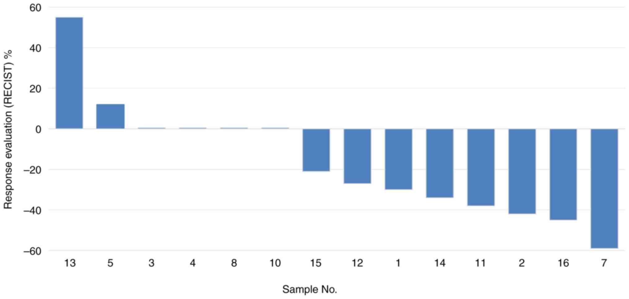 Of 17 NSCLC patients with low levels of EGFR mutations (where the amount of mutant DNA was lower than the LOD), discovered in our hospital, the median age was 69 years and 15 patients (88%) were female (Table III). Of these, 3 patients (patients no. 6, 9, and 17) did not receive TKIs due to a brain metastasis (n=2) or a conservative strategy chosen after lobectomy (n=1). The remaining 14 patients received TKIs and were evaluated for clinical response, in which 10 cases had an L858R mutation and two had an exon 19 deletion. Of the 14 patients, 7 patients (50%) showed partial response, of which, 6 patients (42.8%) had stable disease and 1 patient exhibited disease progression. The distribution of reduction in target-lesion size (waterfall plot) after TKI treatment is shown in Fig. 1.