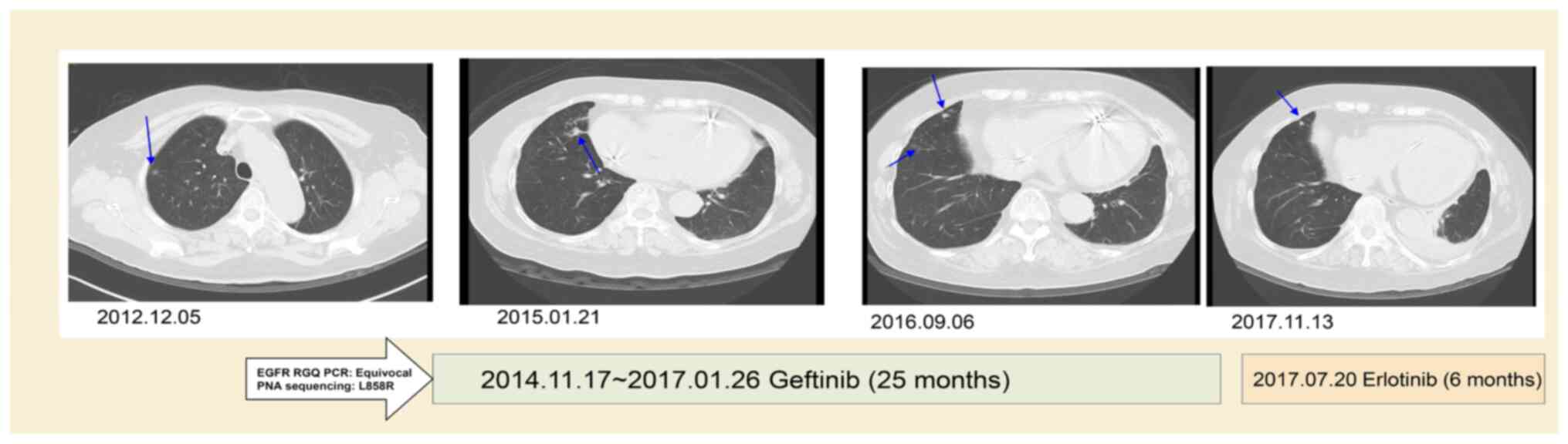 Case 10 was a 78 year female who had stage IIA squamous cell carcinoma (T2aN1M0) and received video-assisted thoracic surgery for the right lower lobe of lung and mediastinal lymph node dissection in 2013. The EGFR RUO kit initially yielded a negative result, with a late upward shifted curve, but was shown to have an EGFR L858R mutation by PNA-sequencing in October 2014. The recurrence of lung cancer with left pleural seeding occurred in November 2014. The patient first received Gefitinib (Iressa; 250 mg OD) treatment for 25 months, which showed mild regression of the left lingual lung. Later, Gefitinib was replaced with Erlotinib (Tarceva; 150 mg OD) for severe xerosis.
