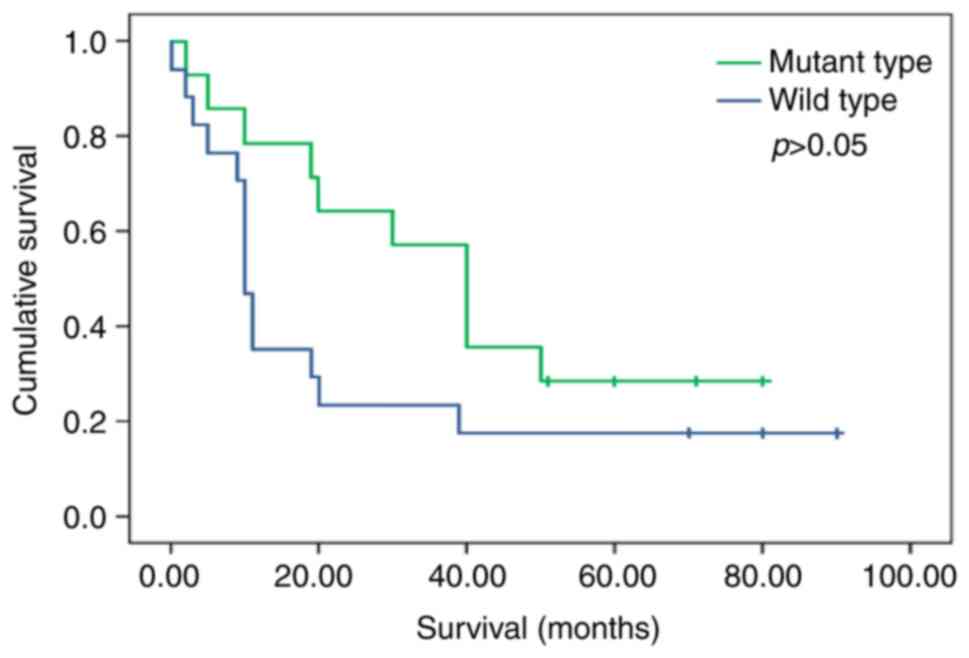 A total of 14 patients with EGFR mutations had a longer 5-year OS (median: 40.0 vs. 10.0 months) after TKI treatment than those with wild-type EGFR (n=17; P=0.085, log-rank test) using a univariate analysis model (Fig. 3). The OS of patients with or without EGFR gene mutations was 40.0 months (95% CI, 24.2–33.8) and 10.0 months (95% CI, 14.7–27.3), respectively. The difference in OS was not significant (P>0.05).